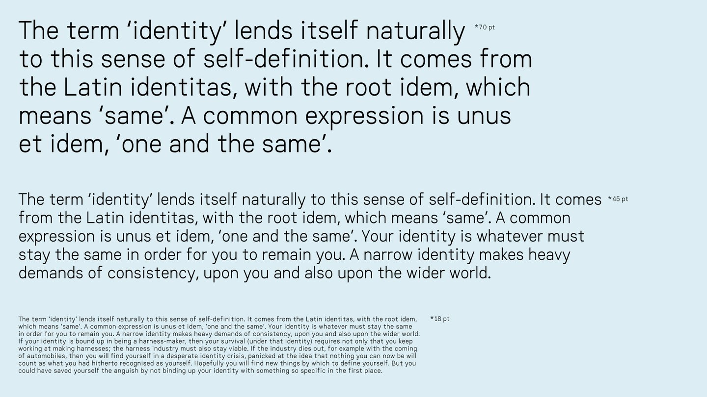 Thin and neutral grotesque, with a slightly outstretched proportions. A font that’s just doing its job is living an honest life.