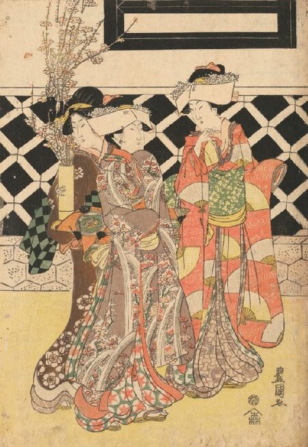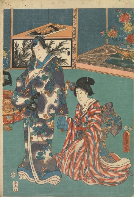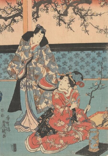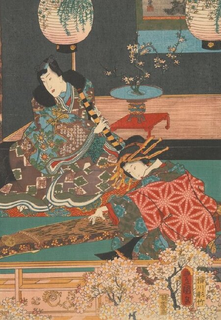 Две женщины в головных уборах и служанка, Утагава Тоёкуни, 1815–1818 гг. , «Деревенский Гэндзи, играющий на флейте, и куртизанка, играющая на кото», Утагава Кунисада, 1854 г.