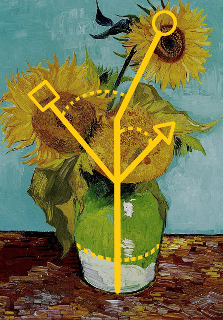 Так, данные правила создают почву для новой интерпретации некоторых цветочных натюрмортов ван Гога. Помимо «Трех подсолнухов в вазе» на предмет соответствия правилам составления икебаны можно также изучить «Вазу с гвоздиками и другими цветами» и «Вазу цветов». Оба букета композиционно можно разделить на три пучка цветов, среди которых один, самый крупный, выше двух других как минимум в полтора раза. Следующий «средний уровень» — белые цветы на первой картине и красные на второй — немного смещены влево, а самые низкие растения, красные и розовые соответственно, «западают» вправо. Композиционное соответствие правилам икебаны позволяет говорить о символах неба и земли, а также человечества, их связующего. И хотя мы не можем знать наверняка закладывал ли Винсент ван Гог подобную идею в свои цветочные натюрморты, «японский взгляд» художника, очевидно, позволил ему, осознанно или нет, «собрать» букеты, отвечающие идеалам и ценностям любимой им культуры.