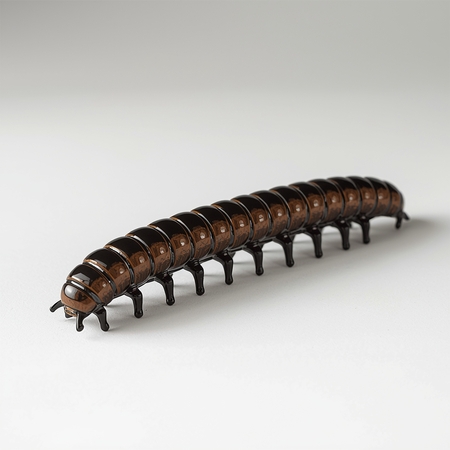 3. Elongated ceramic hair clip inspired by a centipede, linear segmented body form, evenly spaced rounded segments, subtle abstract leg notches, glossy high-shine glaze, black and brown colours, visible hairpin, bold graphic design, modern insect-inspired fashion accessory, studio product photography, soft shadows, neutral neutral background, high detail, cohesive contemporary ceramic style