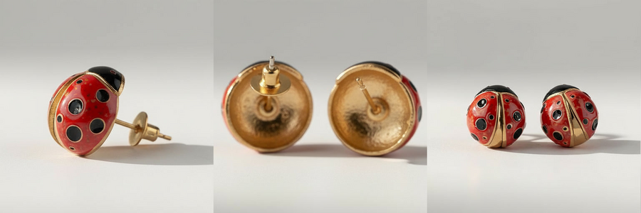 2.Colorful ceramic ladybug-inspired 3d stud earrings, abstract rounded shape, glossy high-shine glaze, raised dot details instead of spots, gold luster accent line, whimsical yet modern design, vibrant red and pastel tones, playful luxury aesthetic, studio product photography, soft diffused lighting, clean neutral background, high detail, contemporary jewelry design, cohesive art accessory style