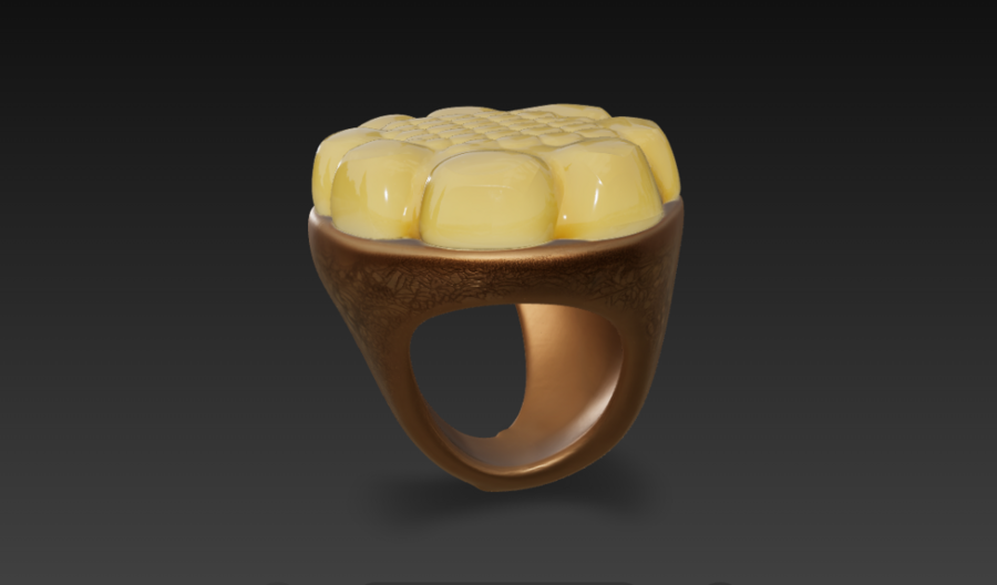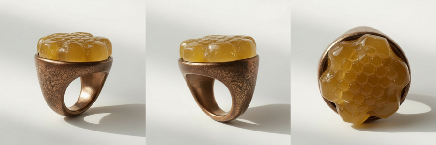 5. Chunky 3d bee-inspired ring, raised hexagonal honeycomb top, luminous honey-toned glaze, playful modern jewelry design, whimsical insect-inspired luxury, studio product photography, soft shadows, neutral background, high detail, cohesive contemporary ceramic style