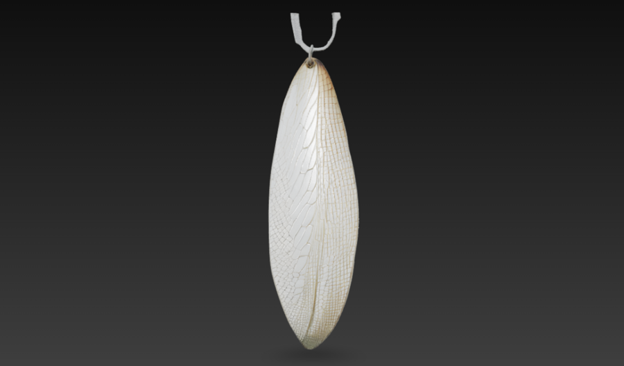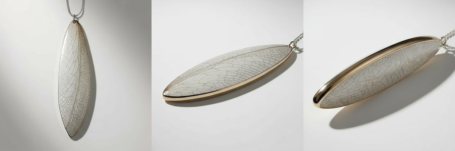 4. 3d glossy ceramic pendant inspired by dragonfly wings only, flattened elongated wing form, delicate engraved vein patterns, translucent glossy glaze, airy elegant aesthetic, modern insect-inspired luxury jewelry, studio product photography, soft shadows, neutral background, high detail, cohesive contemporary ceramic accessory style