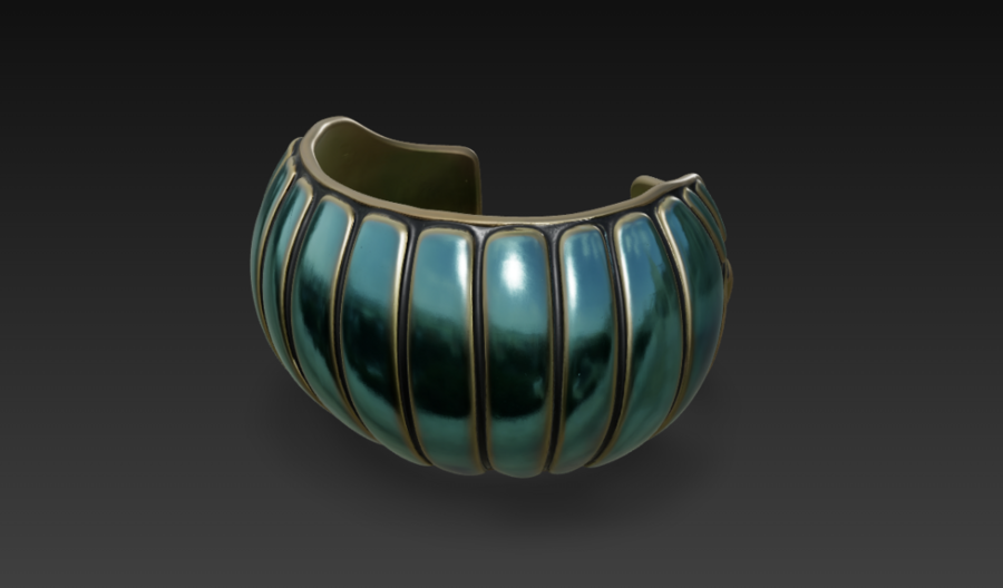 1. Sculptural ceramic cuff 3d bracelet inspired by beetle shell armor, curved organic form, segmented ridges, iridescent emerald green glaze with blue and purple shifts, glossy ceramic finish, bold artistic jewelry, whimsical nature-inspired luxury, studio product photography, soft shadows, neutral background, high detail, cohesive contemporary accessory style