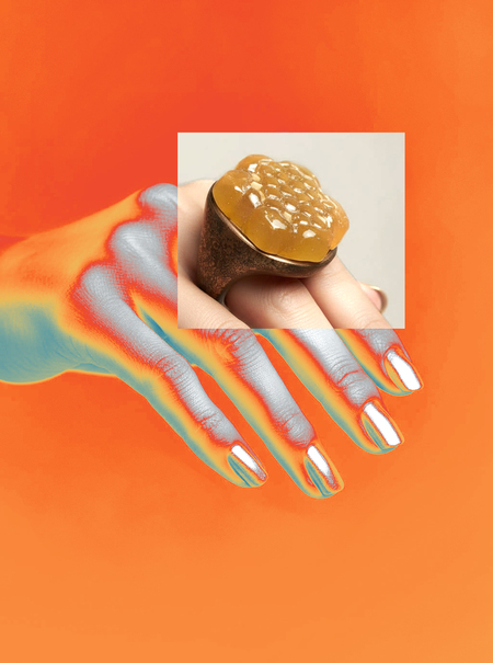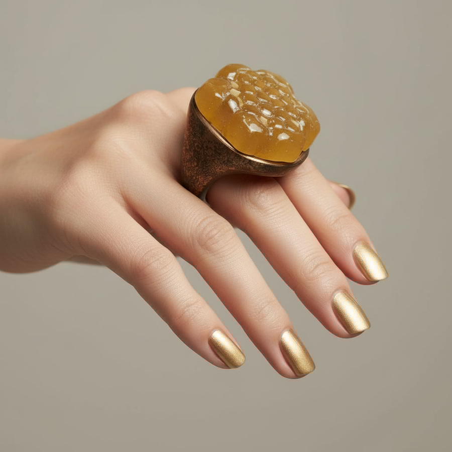 2.Editorial close-up of a model’s hand with nails painted in pastel-metalic golden-yellow colours wearing a chunky ceramic bee-inspired ring, raised hexagonal honeycomb top, glossy ceramic glaze in warm honey tones, modern sculptural jewelry, minimal fashion styling, soft diffused lighting, neutral background, whimsical yet stylish insect-inspired accessory, high detail, contemporary fashion photography