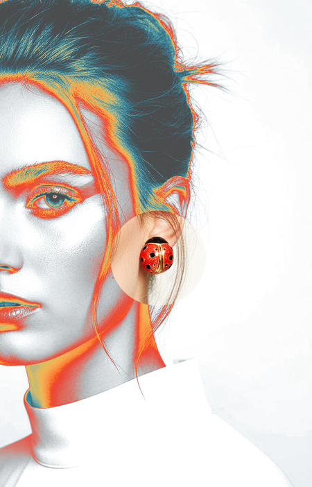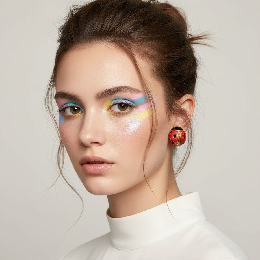 6. Editorial portrait of a young model wearing abstract ceramic ladybug-inspired stud earrings, rounded glossy shapes with raised dot details, vibrant yet refined colors, playful modern design, whimsical insect-inspired jewelry, clean fashion styling, soft diffused studio lighting, neutral background, focus on earrings, high detail, contemporary luxury accessory photography