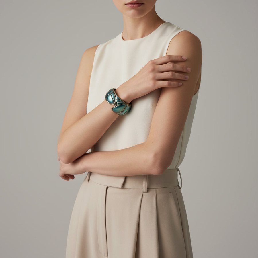 5. Fashion editorial image of a model wearing a sculptural ceramic beetle shell cuff bracelet, curved segmented armor-inspired form with glossy iridescent glaze clearly visible, expressive yet calm pose, subtle whimsical styling, clean neutral background, soft studio lighting, strong focus on bracelet, high detail, contemporary artistic jewelry photography