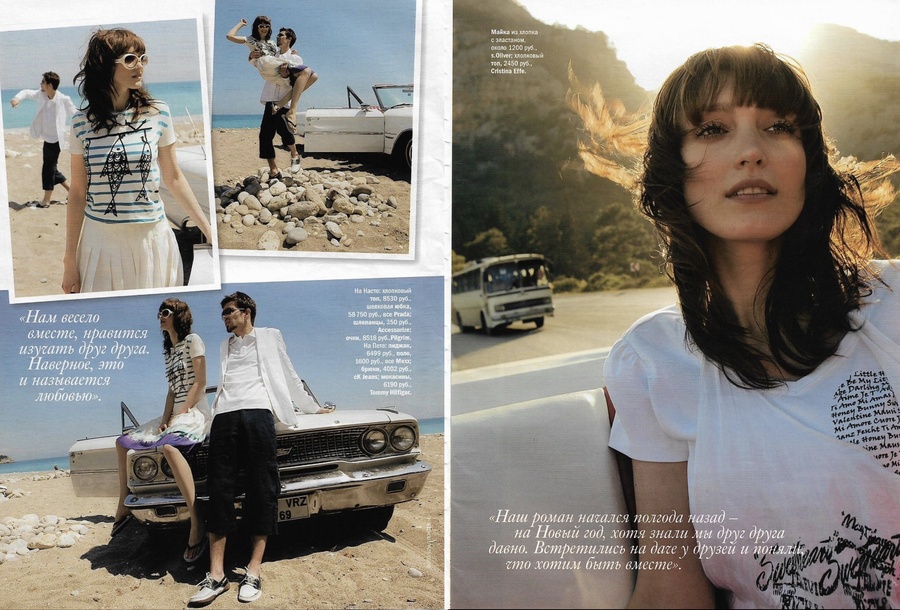 «Сентиментальное путешествие» Glamour, август 2005 фото: Влад Локтев модель: Настя Иванова и актер Петр Федоров стилист: Маша Федорова макияж: Вероника Шеповалова