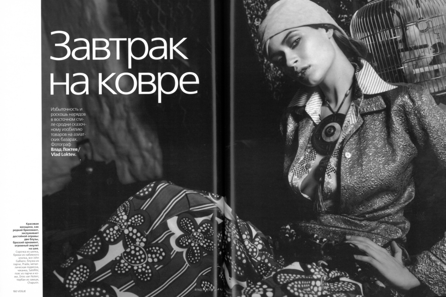 «Завтрак на ковре». В съемке среди прочих использована одежда Алишера и Chapurin. Vogue, май 2002 фото: Влад Локтев макияж: Наталья Власова