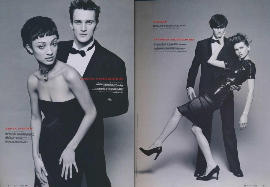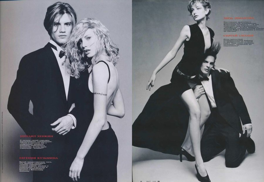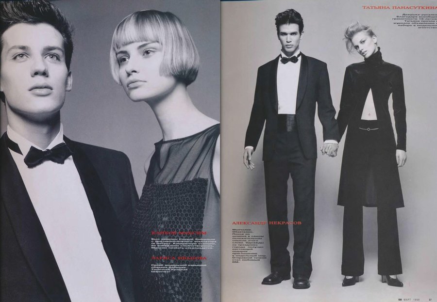 «Черное и белое» «ОМ», апрель 1997 фото: Влад Локтев, стиль: Алишер модели: Сергей Стрельников, Елена Ляндрес, Светлана Ушакова На первом развороте костюмы Елены Супрун