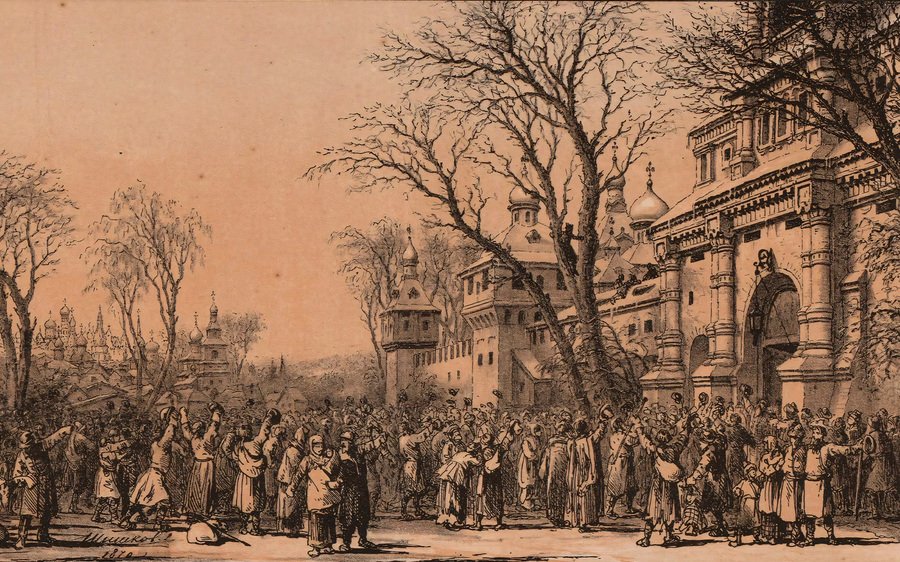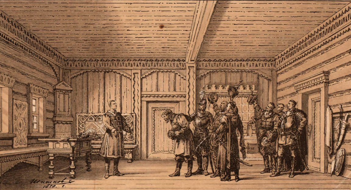Рисованные на камне сцены М. А. Шишковым; составлены и рисованы А. И. Шарлеманем. Рисунки декораций к трагедии А. С. Пушкина «Борис Годунов». 1870 г.