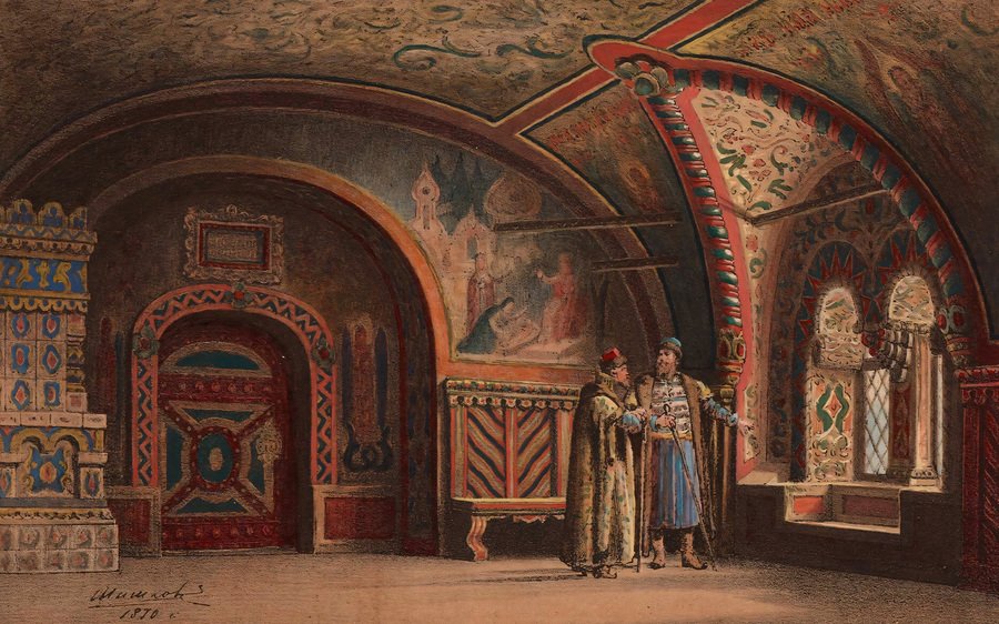 Постановка же 1867 года «Смерть Иоанна Грозного» А. Толстого стала не просто музейной демонстрацией научных исследований, а декоративными картинами на тему Древней Руси на основе археологического натурализма. Декорации Шишкова, такие как «Покои царицы Марии Федоровны» и «Престольная палата», были созданы художником с исторических архитектурных памятников в собственном стиле псевдорусской декоративности. Картины «Царская дума» и «Площадь перед собором в Москве», написанные Шишковым для трагедии «Борис Годунов», также воспринимались как археологический натурализм. Будучи учеником А. Роллера, Шишкову удалось придать сценам узнаваемости подлинности, при этом искусно передавая детали — яркие цвета солнечного дня на Красной площади, многоцветие храмов, стен и башен.