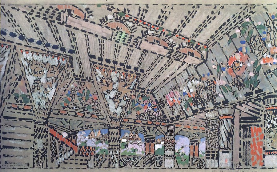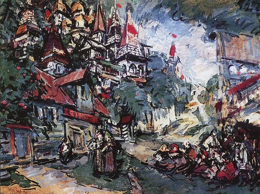 Так, эскиз терема одной из сцен «Аскольдовой могилы», напоминает скорее индийский дворец с висячими галереями и тонкими китайскими кронштейнами, а многоярусная и ажурная композиция больше ассоциируются с мавританским стилем и испанской Альгамброй.