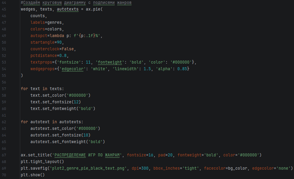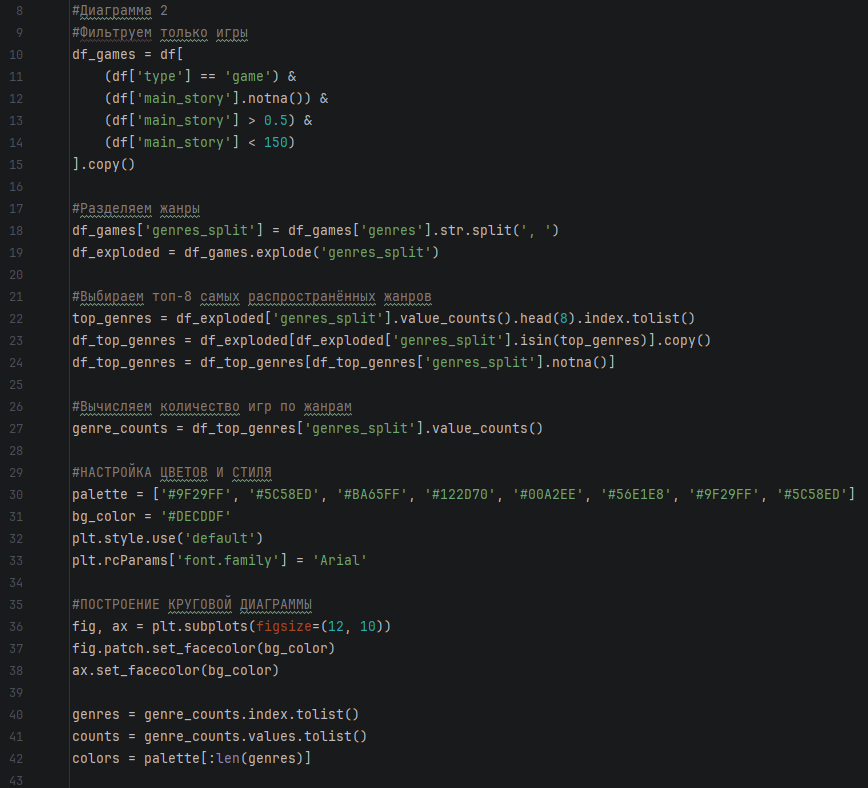 Вторая круговая диаграмма наглядно помогает понять, какие игры люди выбирают чаще. Данные показают, что жанр Action — выбор большинства, так как занимает 23,7% рынка. Это кажется логичным. Экшн-игры обычно динамичные, зрелищные и доступные для широкой аудитории.