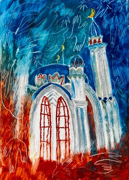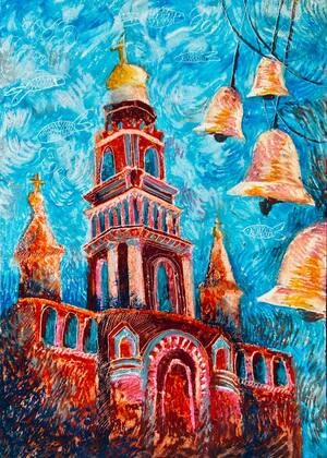 Pictures are modular and can be collected in two rows as well as in one wide band with key colour spots. The left-hand and right-hand paintings are pictures of religious structures: the Kul-Sharif Mosque and the Cathedral of Bogojavlen. In Kazan, Orthodox and Muslim religions have a surprisingly organic and close connection, shaping the city ' s cultural landscape with all its identity and beauty.