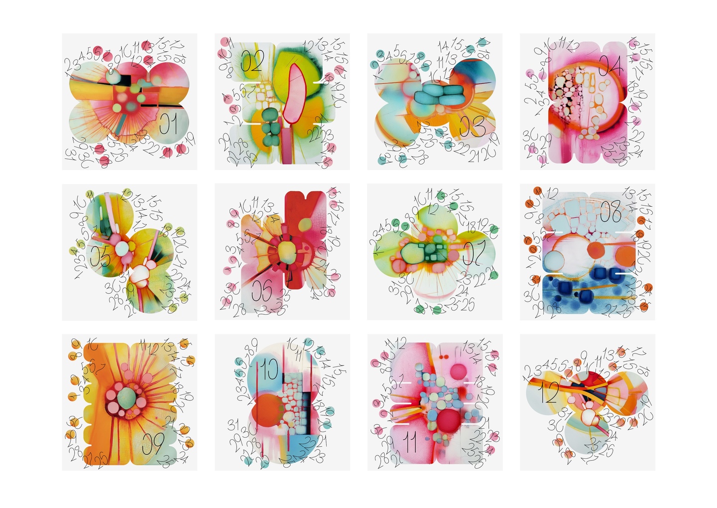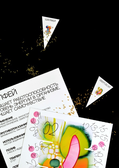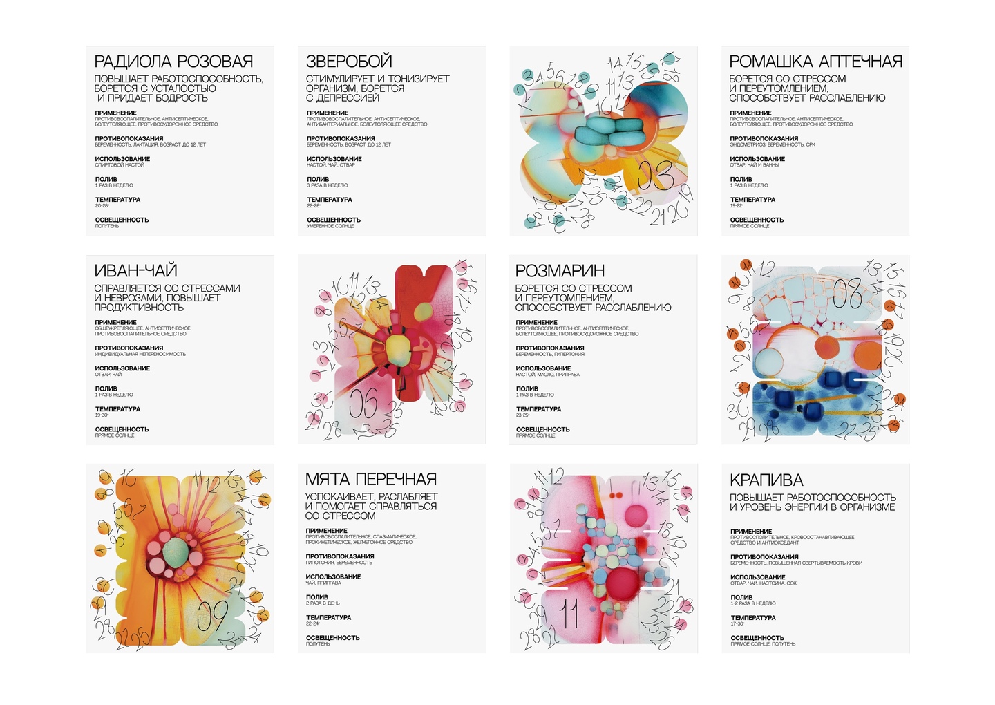 Календарь был сделан с использованием нейросетей. Созданная вручную абстракция, соответствующая эффекту от действия растения, с помощью ИИ была соединена с изображением клетки растения и использовалась для оформления страницы календаря. При создании цифр для дней и месяцев также были использованы нейросети.