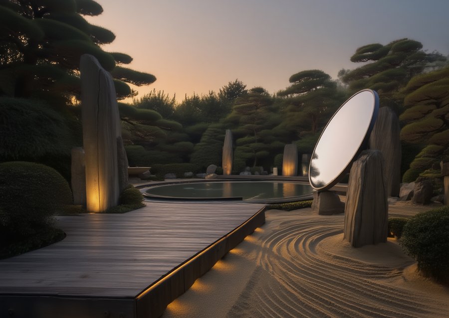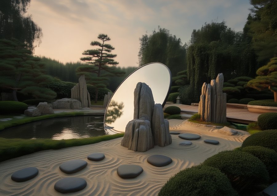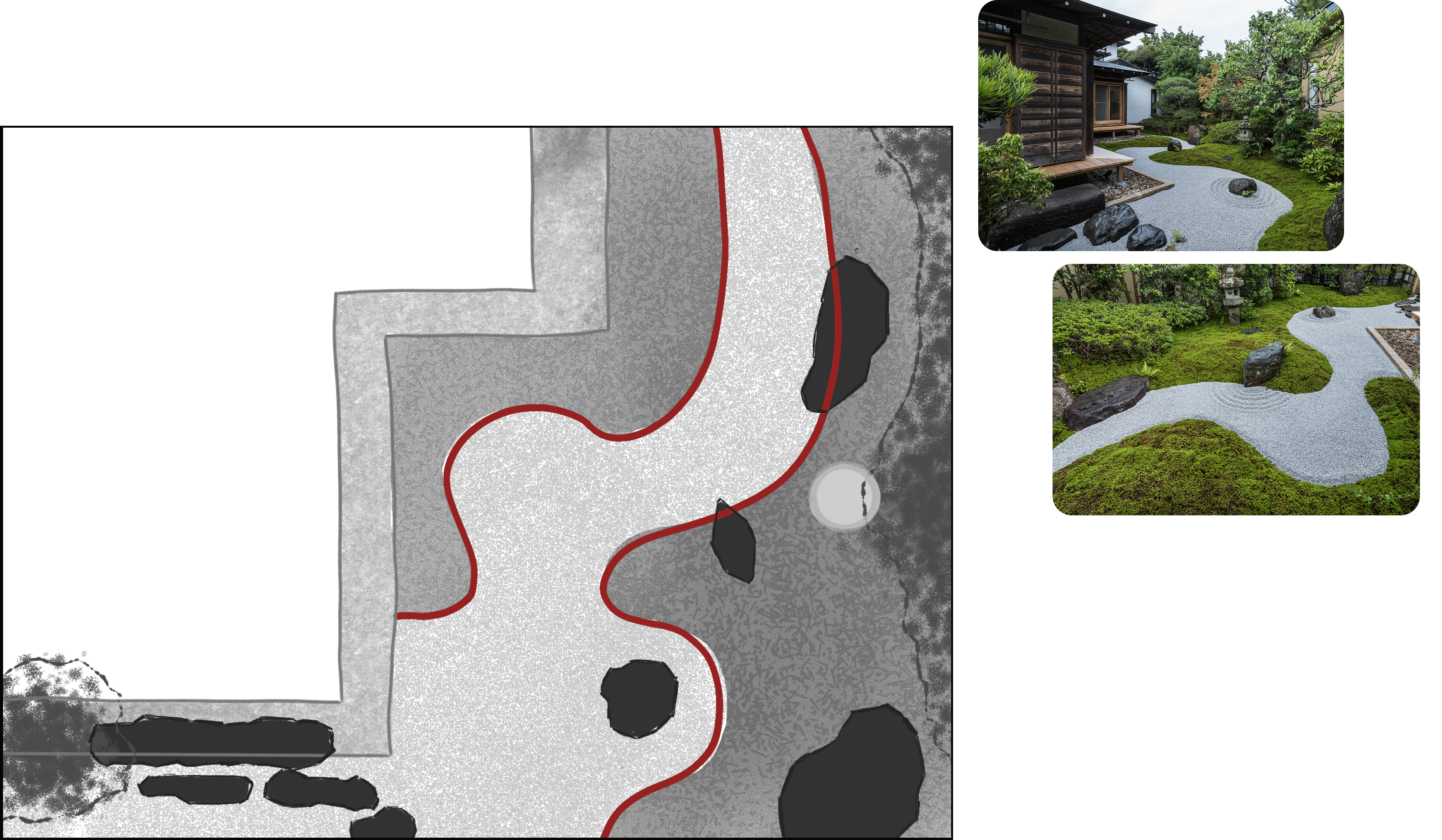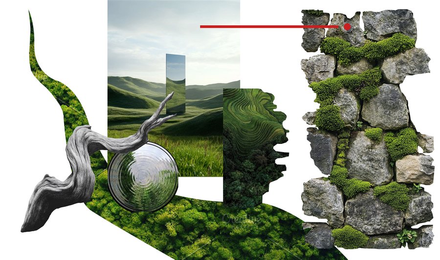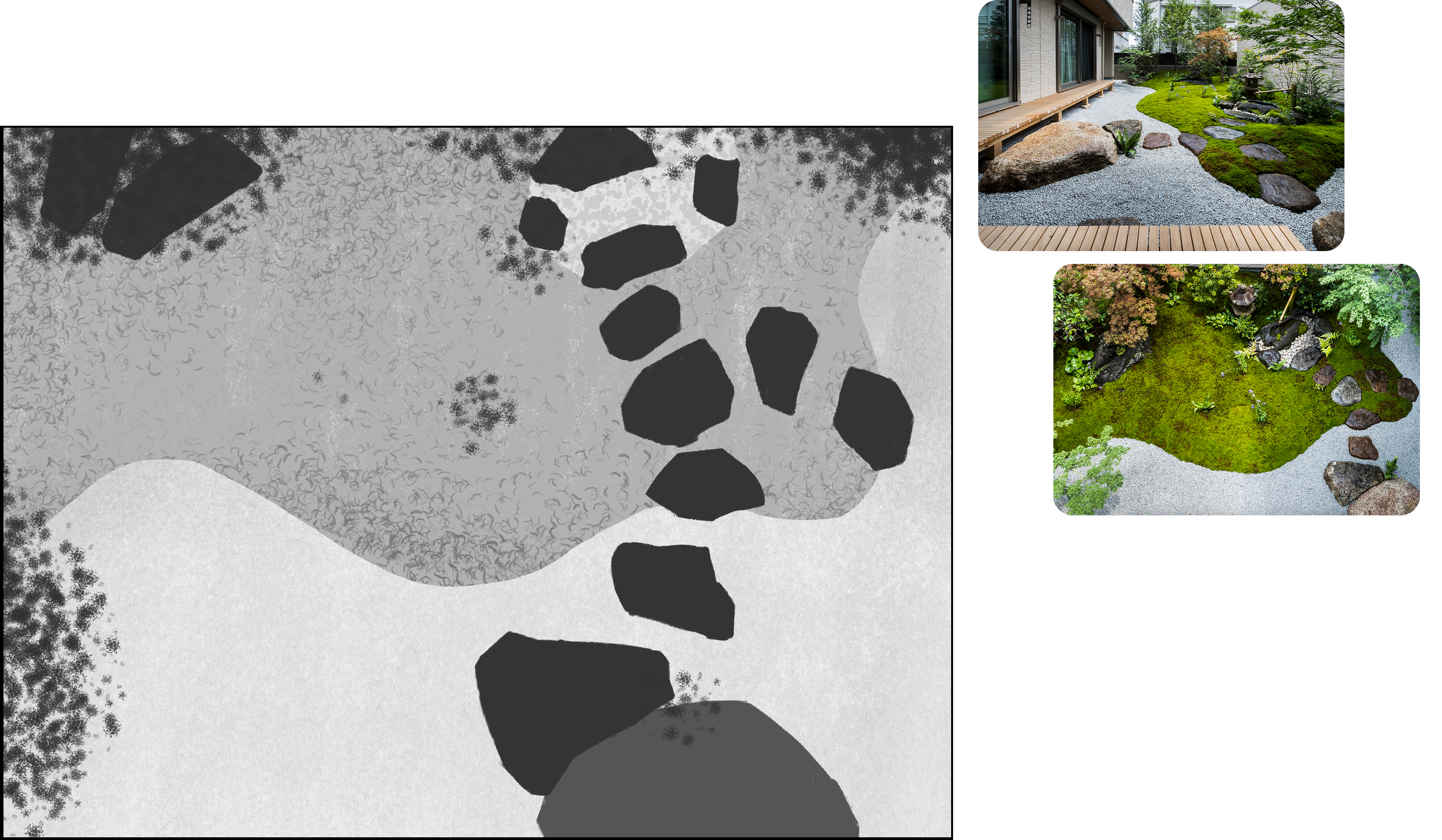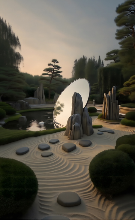 Мудборд к манифесту [1] отражает философию сада Масуно Сюнмё — пространство тишины и созерцания. Камни и мох символизируют время и память, холмы — дыхание природы, а сухая ветвь напоминает движение ума. Зеркальная поверхность становится образом пустоты, в которой рождается смысл.