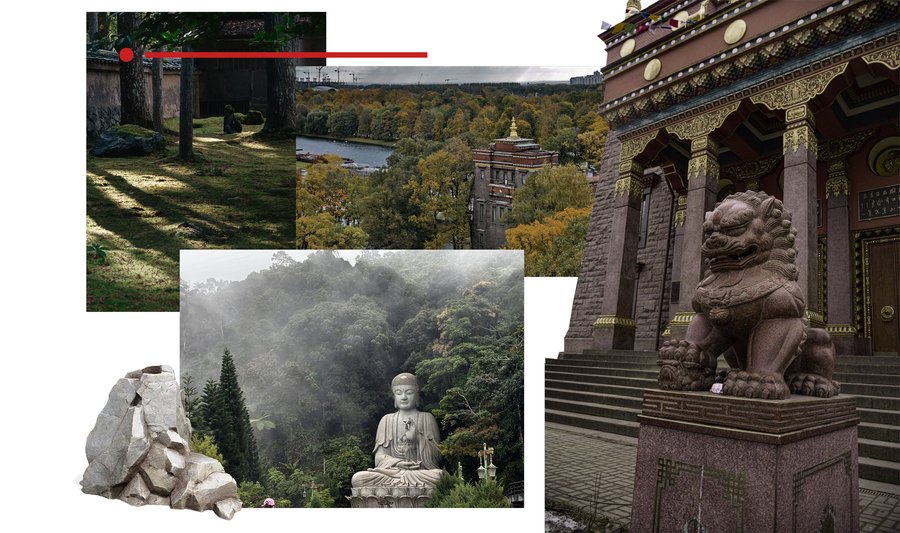 Мудборд места [2] передаёт идею соединения внутренней тишины дзэн и духовной силы буддийской традиции. Он отражает поиск гармонии между природой и архитектурой, временем и присутствием.