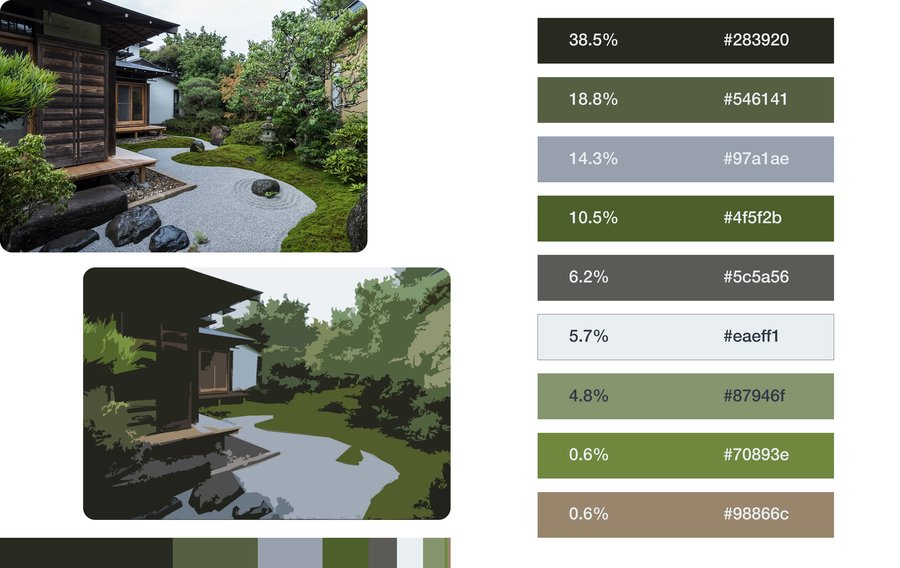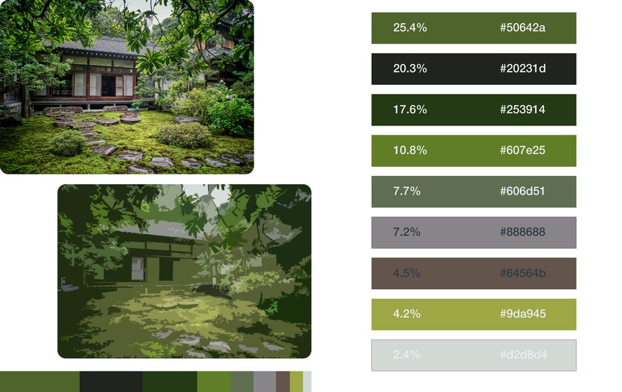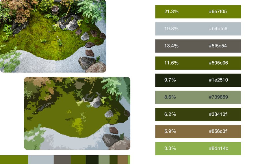Цветовой анализ показывает доминирование глубокой, приглушенной и естественной палитры, соответствующей эстетике Дзен. Палитре много темных, оливковых и лесных зеленых оттенков, символизирующих вечную тень, влажность и покой мха и листвы. Эти цвета уравновешиваются темными, почти черными, коричневыми тонами деревянных структур и приглушенными серыми оттенками камня и гравия, которые служат структурными и медитативными якорями. Низкая насыщенность и отсутствие ярких акцентов в этой монохромной гамме сознательно формируют атмосферу тишины, созерцания и элегантной простоты.
