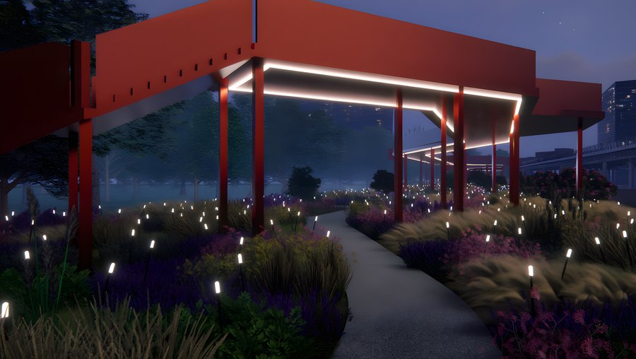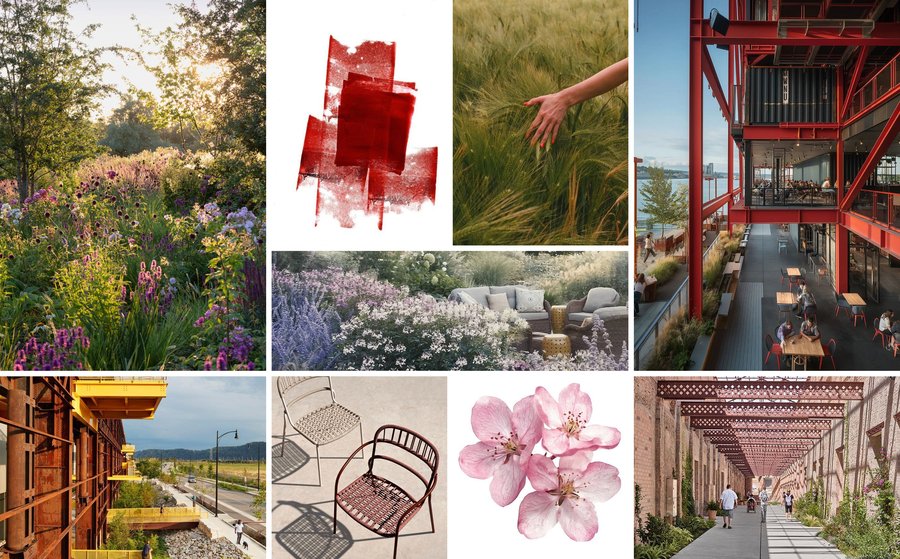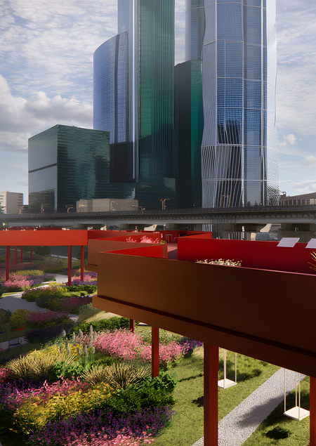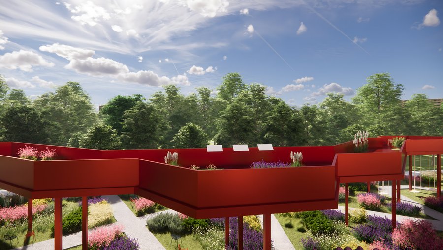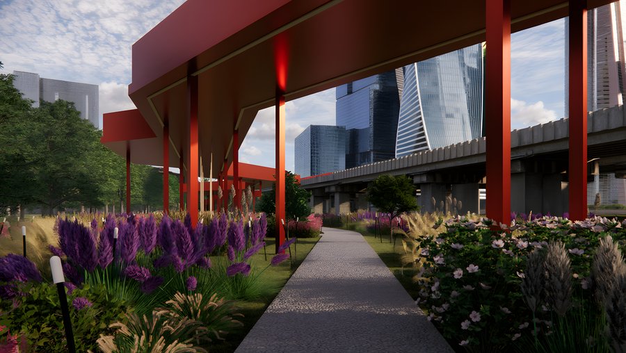 В основе — многолетники и злаки, ощущение луга, вступающего в диалог с архитектурой и городским пейзажем, но не конфликтующего с лесом.