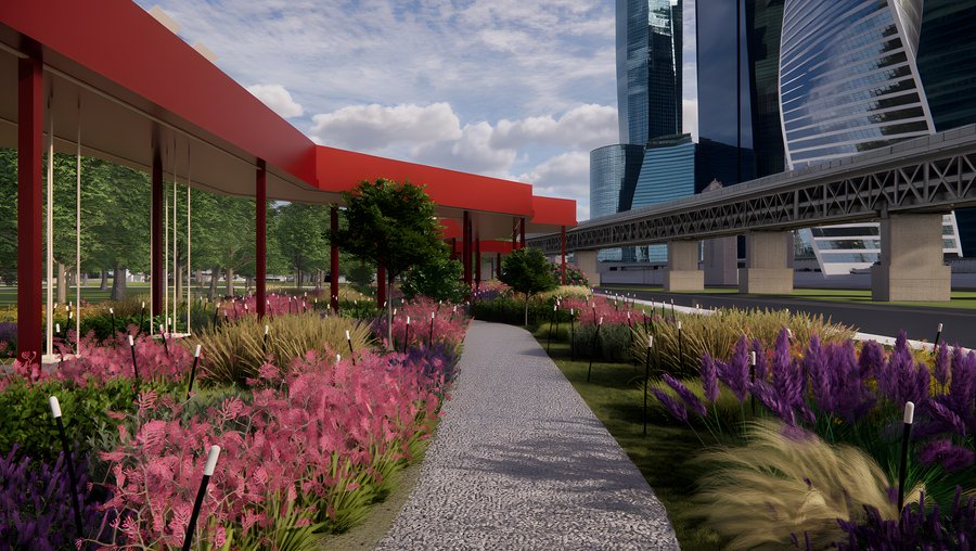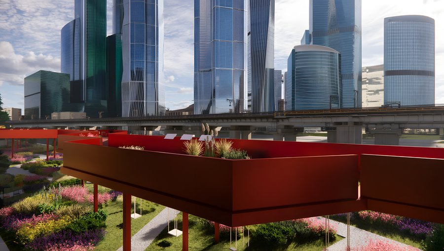 С западной стороны сад окружен лесом, а с восточной он граничит с железно-дорожными путями МЦК и МЦД на эстакаде и небоскребами Москвы-Сити