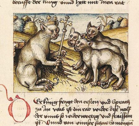 Не смотря на всё вышесказанное, котов также часто изображали в обличии власти, выдавая им короны и скипетры. Это, вероятно, было связано с характером котов. Они гордые и властные создания, от чего и пошла такая ассоциация. Но, очевидно, такие изображения тоже несли скорее сатирический, комический характер.