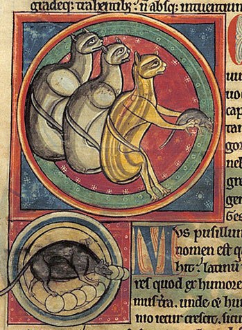 Также на средневековых изображениях коты часто подвергались всевозможным издевательствам. Это было связано с неоднозначным отношением людей к ним.