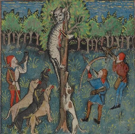 Охота на дикого кота. Гастон III де Фуа. XIV век. / Казнь кошек на Гревской площади Париже в ночь летнего солнцестояния. Неизвестный автор. Период средневековья.