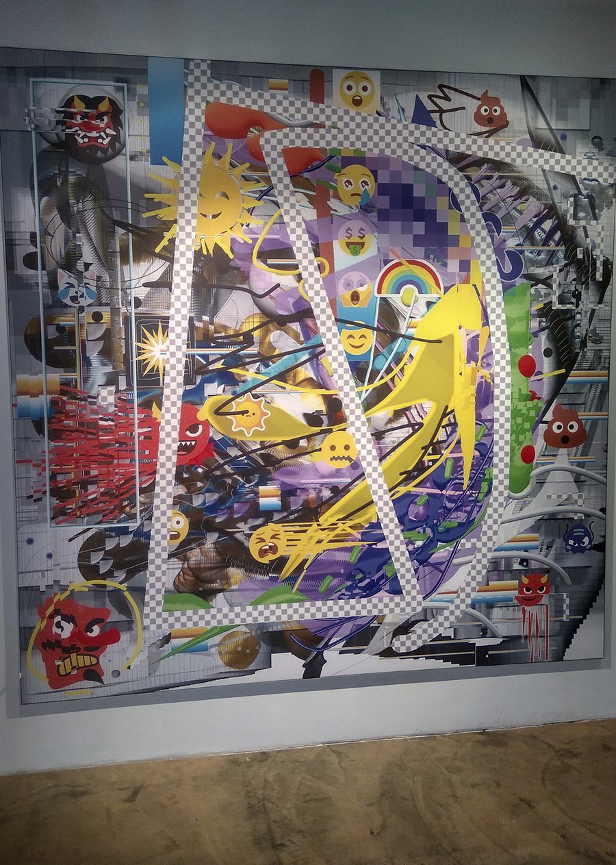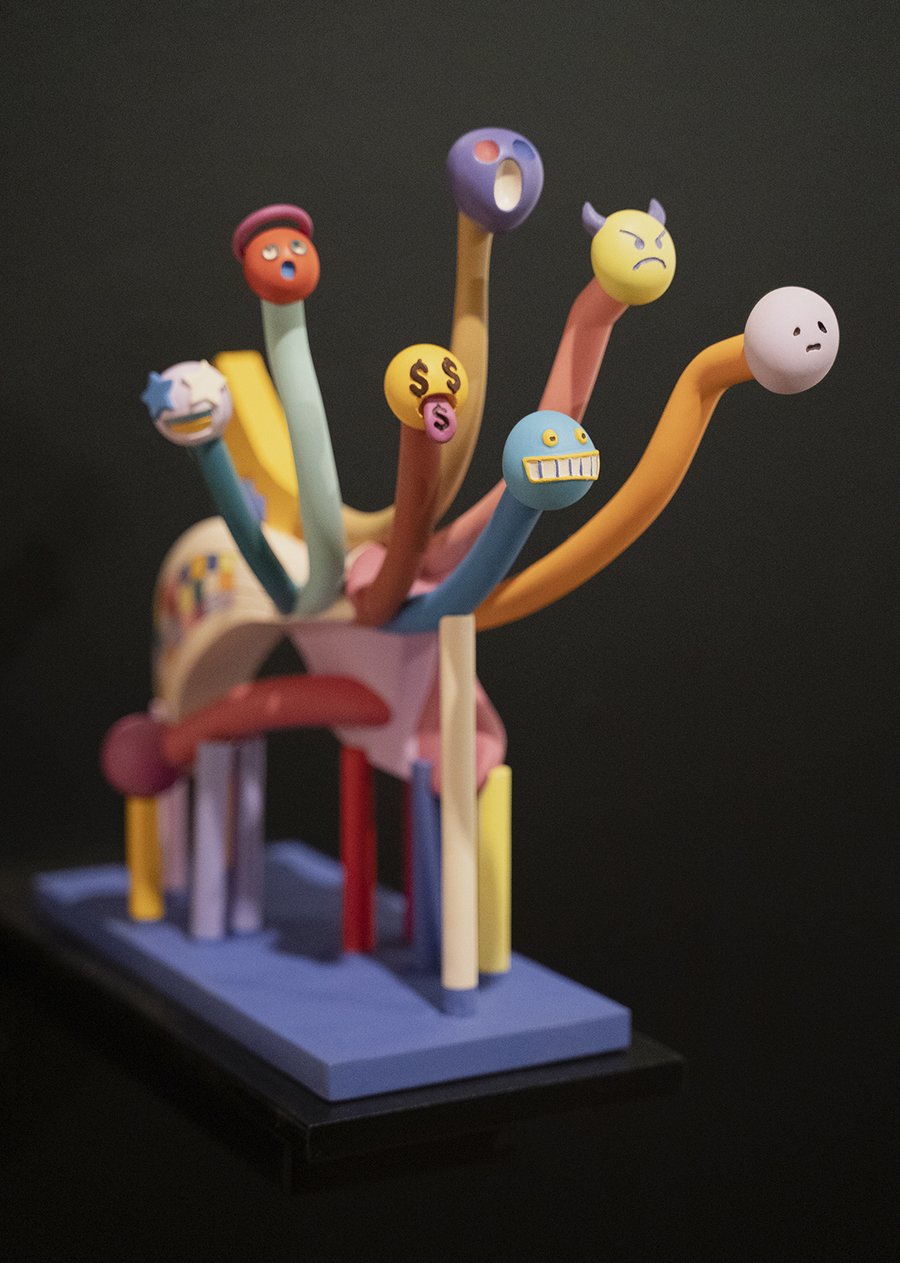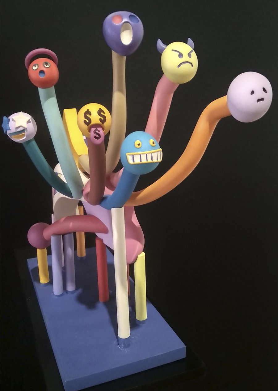 В наших калевальских широтах сюжет об исчезновении солнца естественный, и каждый автор придает ему свое значение. Через столетие Максим Свищёв говорит о краже «внутреннего Солнца» — ясного видения мира, свободы самосознания, искаженных суетностью коммуникации, взрывами медиа. В его инсталляции солнце крадут эмодзи — агенты затмения, похожие и на японские аниме, и на протоплазму сюрреалистичного Кандинского. Для Свищёва эмодзи — это в прямом смысле слова действующие лица современного образа жизни, или «хаоса в голове современного человека, который постоянно испытывает перегрузки, находясь в информационно-эмоциональном потоке. И эмоциональные перепады, желания, страдания являются, словно бы, тучами, заслоняющими внутреннее Солнце. Эмодзи в телефоне, приковывающие внимание, удерживают на себе взгляд и мысль, как на заслонках». текст — Екатерина Андреева.