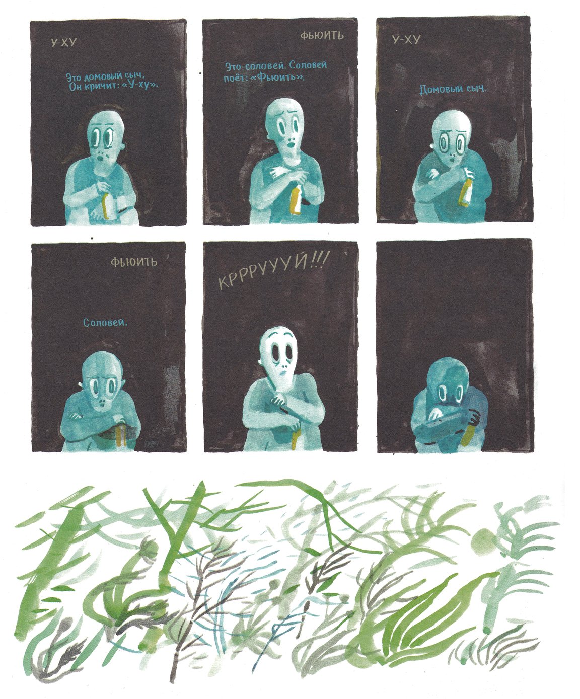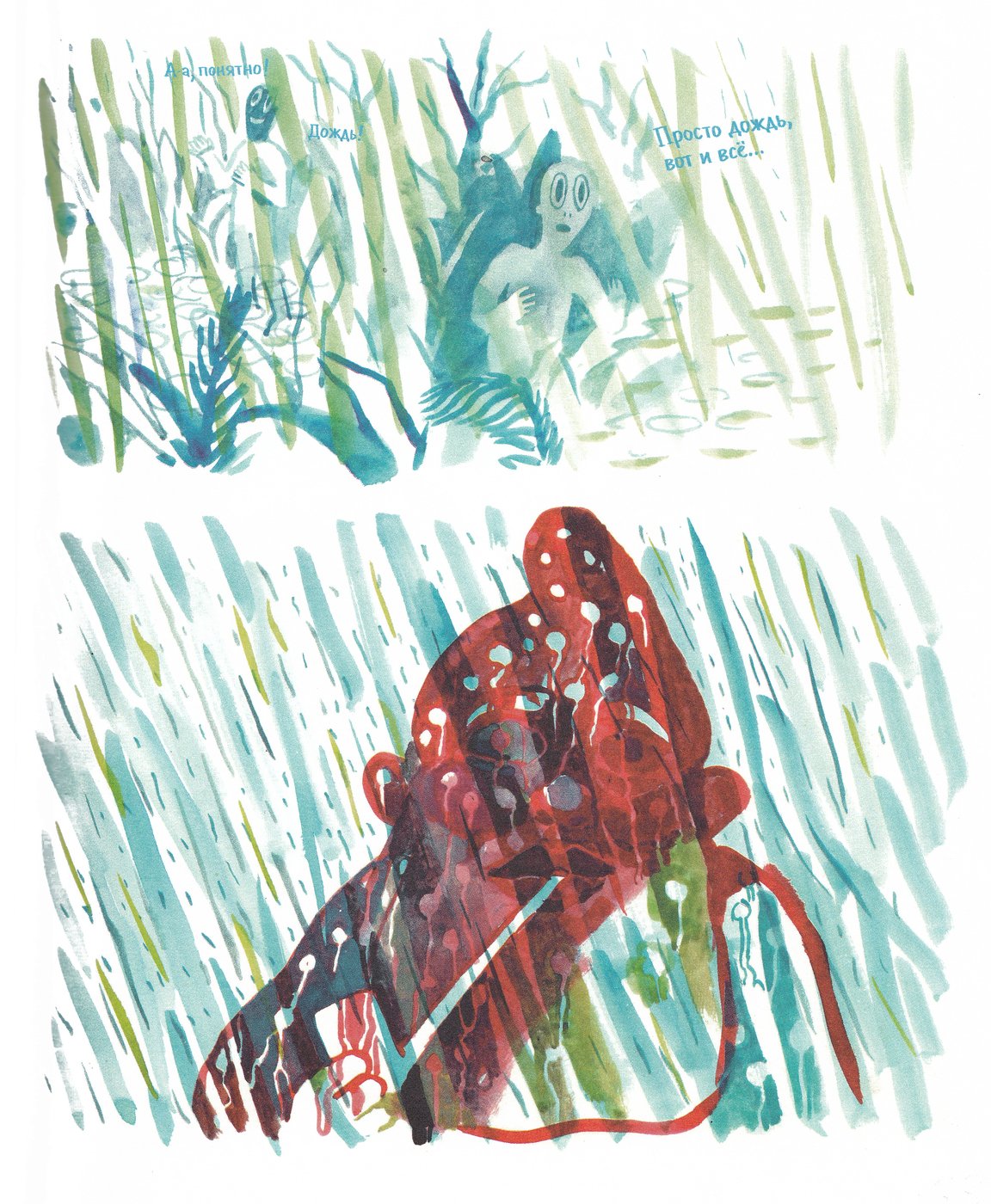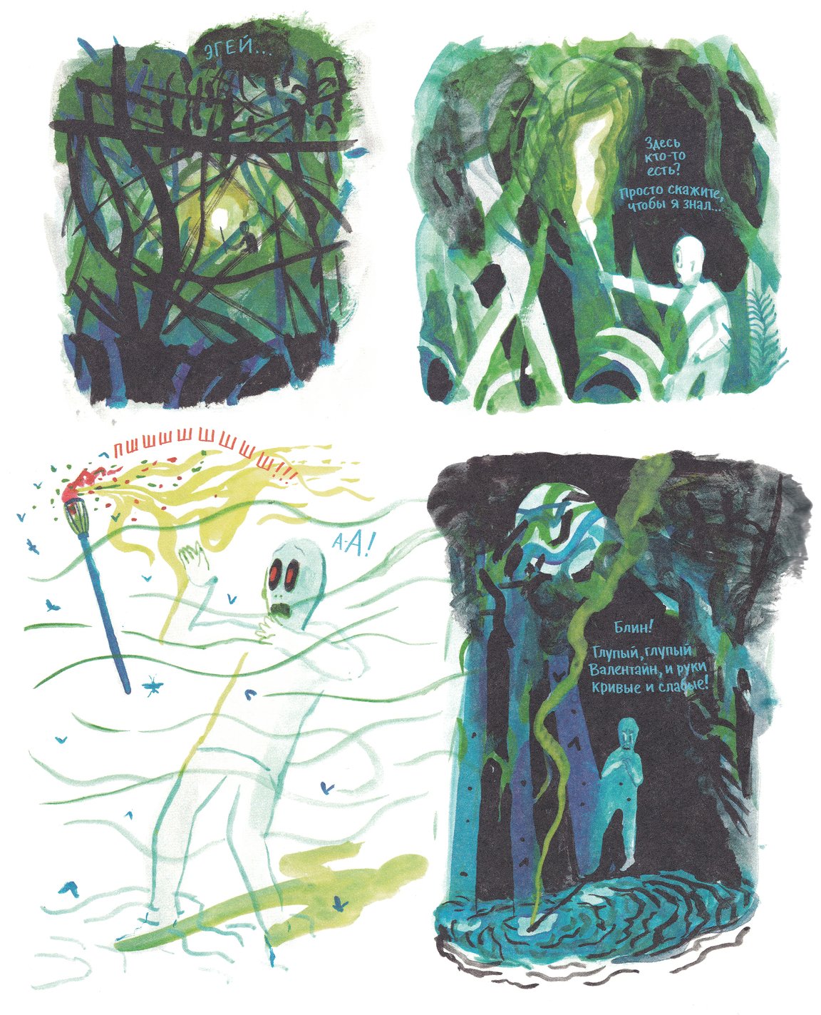 Одна из ярких полос комикса с изображением природы напоминает о картинах Анри Руссо.