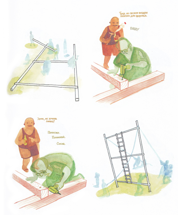 Эрик хорошо разбирается в плотническом деле. Когда Дэнни предлагает ему «пивка», Эрик отвечает: «Попозже. Понюхай. Сосна». Он также указывает, что «брусья с ровными, параллельными годичными кольцами — самые прочные».