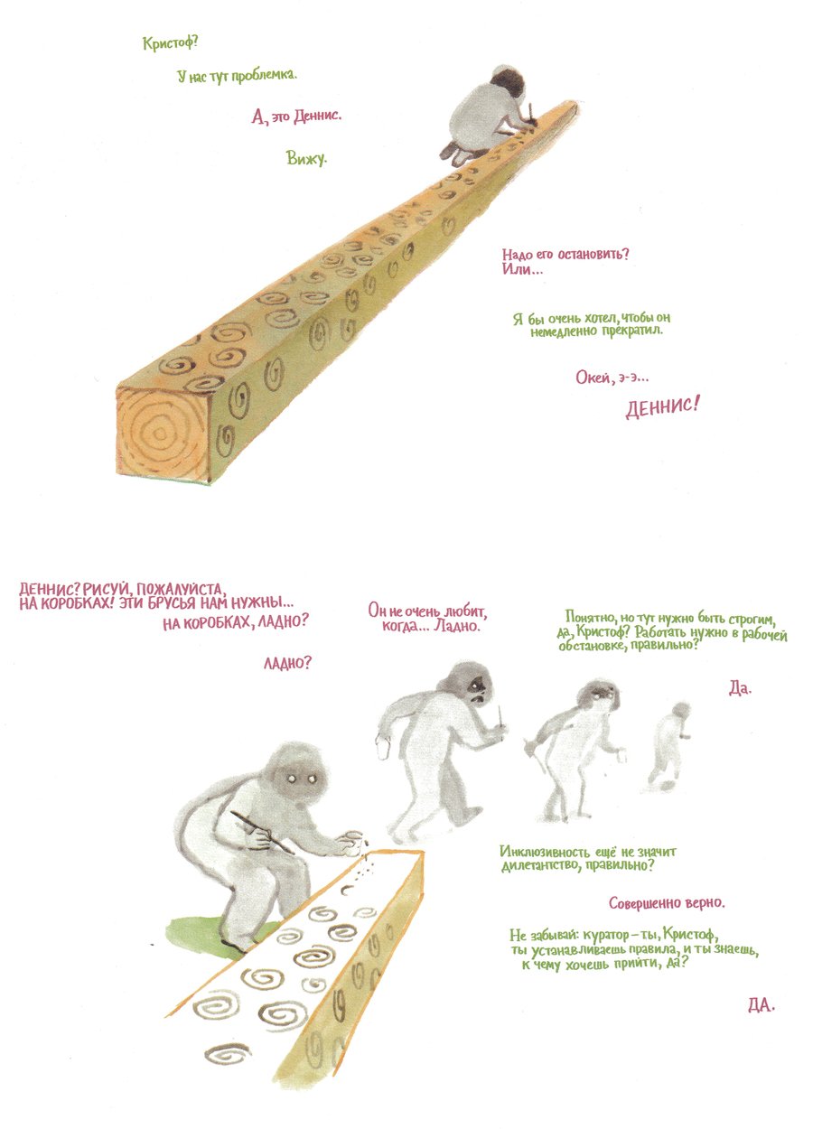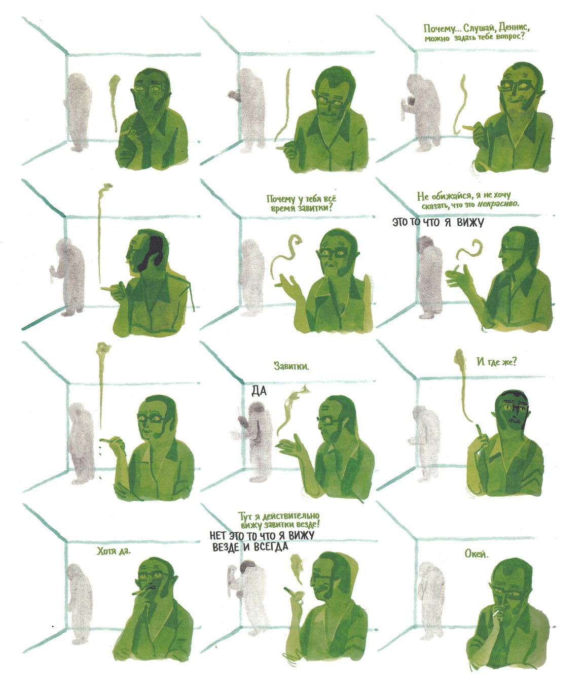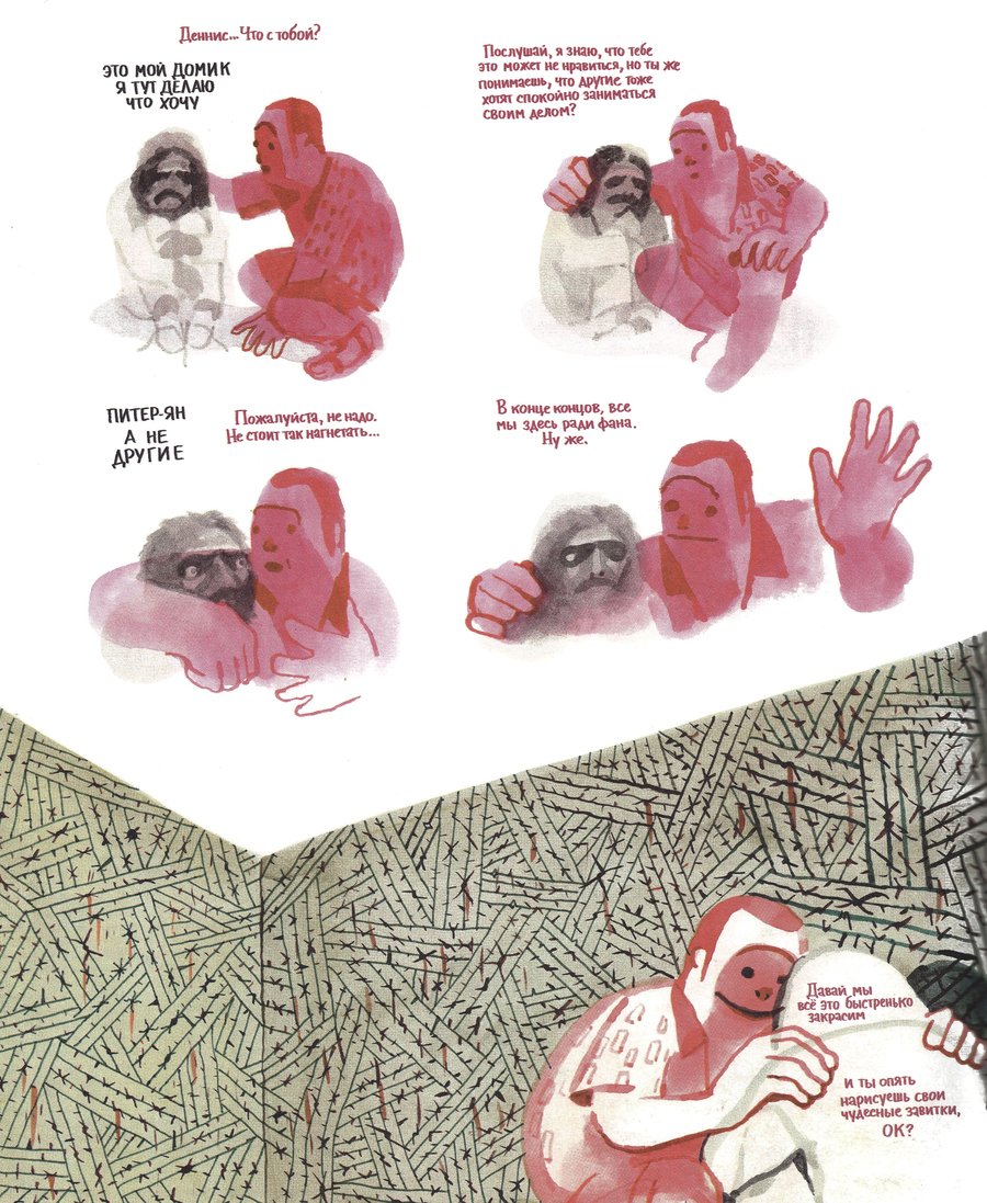 Он разрисовывает завитками даже чертеж, после чего Питер-Ян предлагает Кристофу «поговорить о Деннисе», и специально для него сооружают комнату, которую он может разрисовать полностью. В этот момент у Денниса случается эмоциональный кризис. Диалог Питер-Яна с Деннисом обращает на себя внимание тем, что занимает два разворота. После этого разговора Деннис нападает на Питер-Яна. Денниса забирают в полицию.