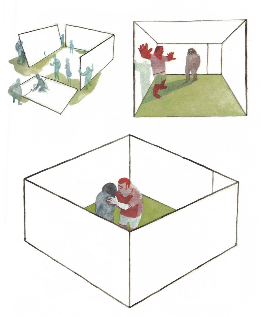 Когда Валентайн, один из жителей деревни и участников фестиваля, жалуется Питер-Яну, что «они все бездари», Питер-Ян утешает его и обнимает. Является ли этот жест искренним, или же он продолжает тему лжи, которая присутствует в других комиксах Брехта Эвенса? Автор не дает ответа на этот вопрос. Но по мере общения Питер-Яна с другими участниками фестиваля мы увидим трансформацию главного героя: после того как Питер-Ян узнает о том, что садового гнома, над которым команда работала несколько дней, уносит ливень, он утешает других участников фестиваля и приходит к выводу, что все это было им нужно прежде всего «ради самих себя»: «Потому что это нужно нам самим и мы не можем без этого. Как не можем дышать!». Хотя Питер-Ян на протяжении всего комикса занимается самолюбованием и изображается тщеславным персонажем, в конце комикса мы видим его искреннюю любовь к коллективному процессу.