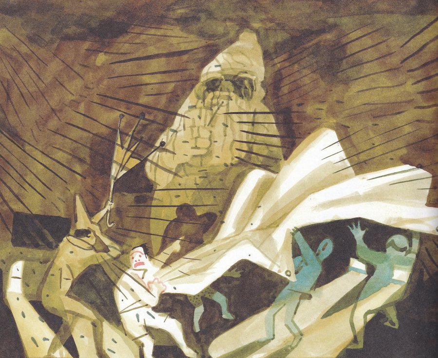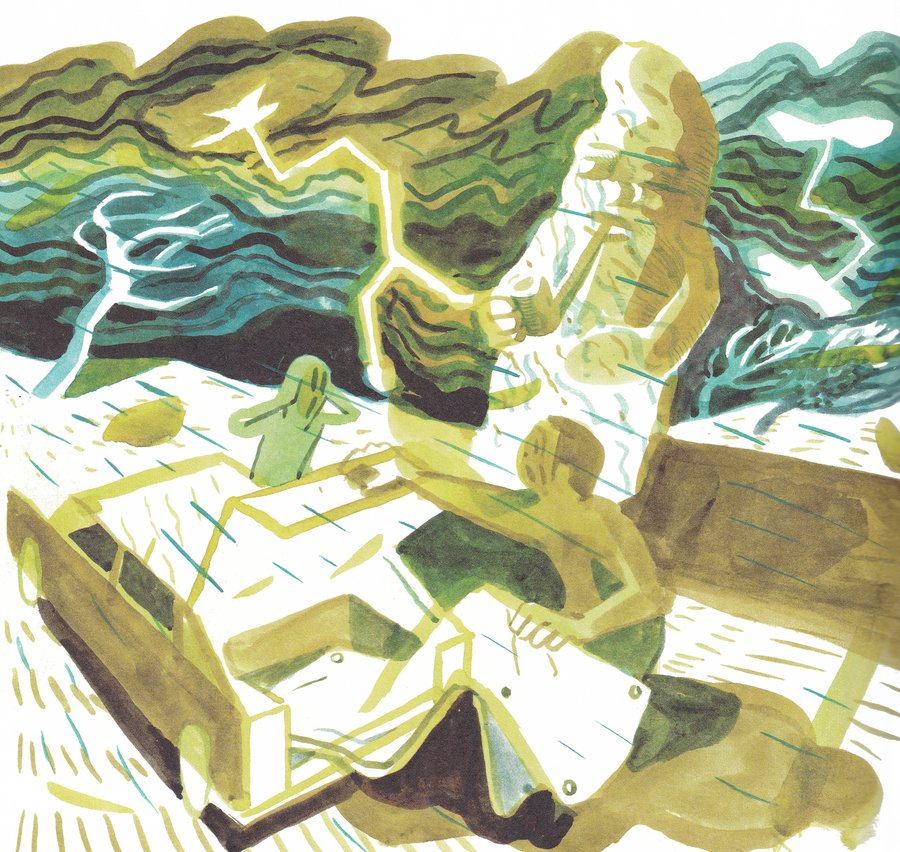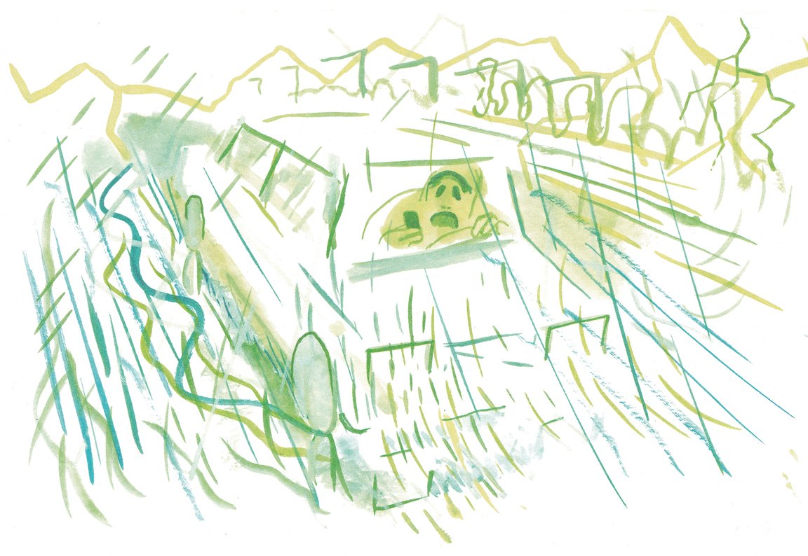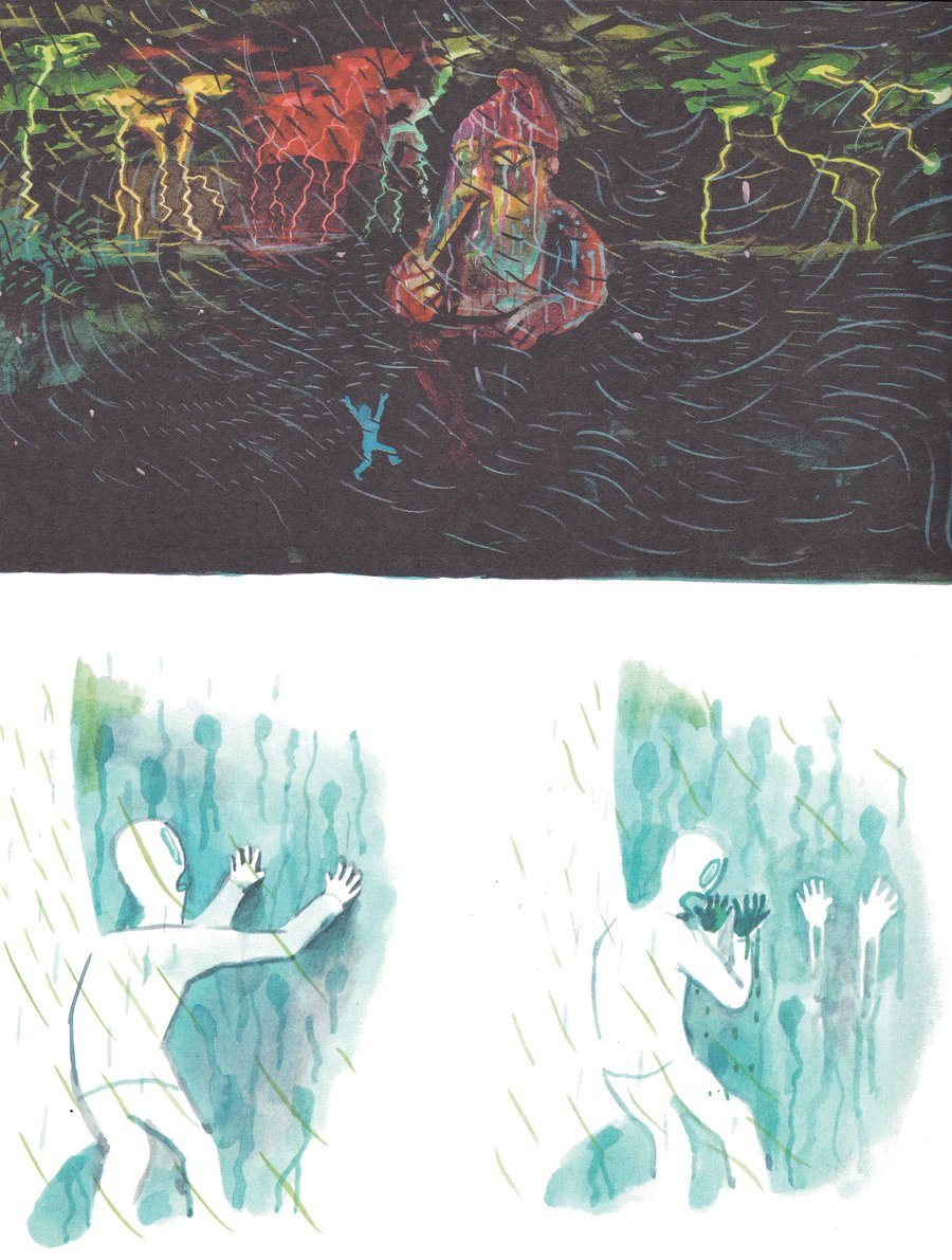 Тревожность усиливается, когда Валентайн, видя, как гнома смывает ливень, звонит ночью Кристофу. После этого Кристоф звонит Питер-Яну, который не отвечает на звонок. При изображении этой ситуации автор использует резкие линии. Для спасения гнома собирается вся команда, кроме Питер-Яна. Создается противоречивое впечатление, что группу деревенских жителей результат их деятельности интересует гораздо больше, чем Питер-Яна.