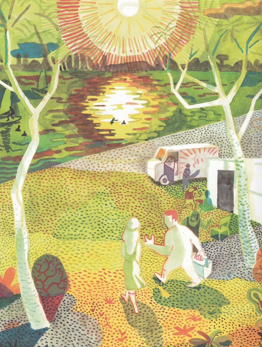 В комиксе прослеживаются отсылки на культовые произведения искусства. Вместо изображений идиллической сельской местности мы видим пейзажи, нарисованные точками в манере пуантилизма, которые мог бы создать французский художник Жорж-Пьер Сёра́.