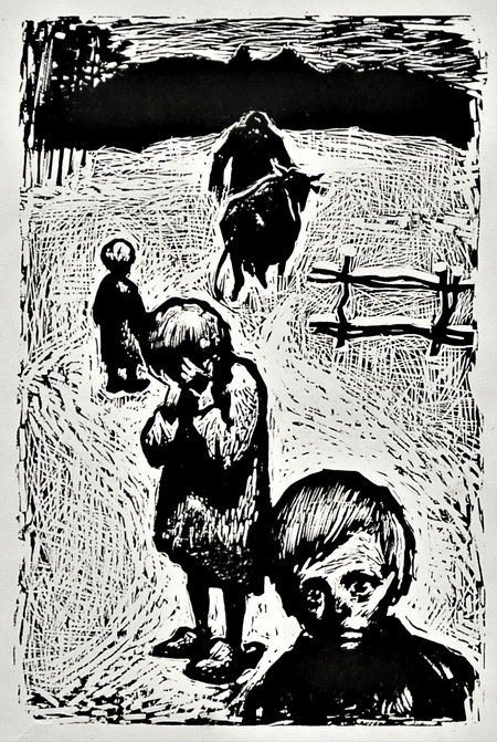 Гравюра «Дети на улице» — одна из самых контрастных среди всех рассмотренных. Помимо визуального воздействия, этот контраст помогает передать общую драматичность сюжета. Также меня зацепил очень «рваный», хаотичный штрих, который хорошо передаёт эмоциональное состояние и внутреннее напряжение изображённых героев.