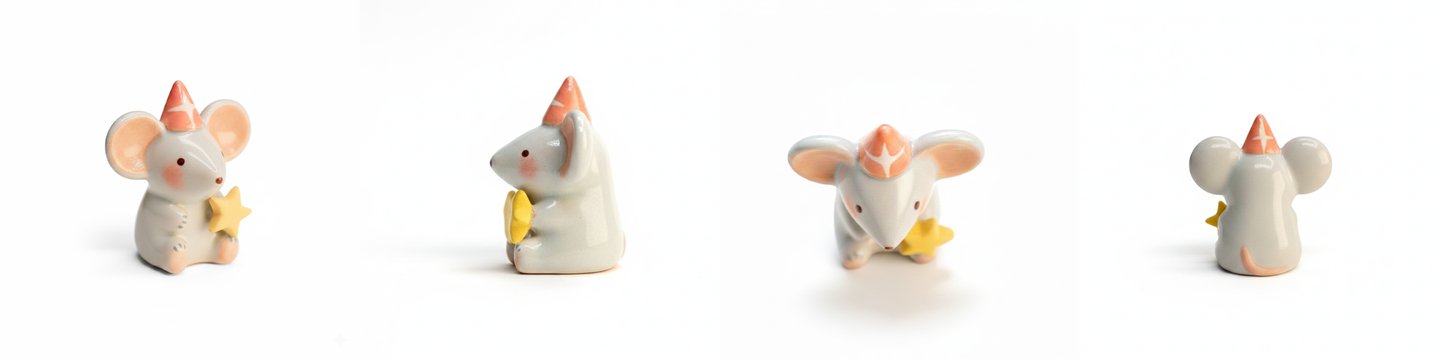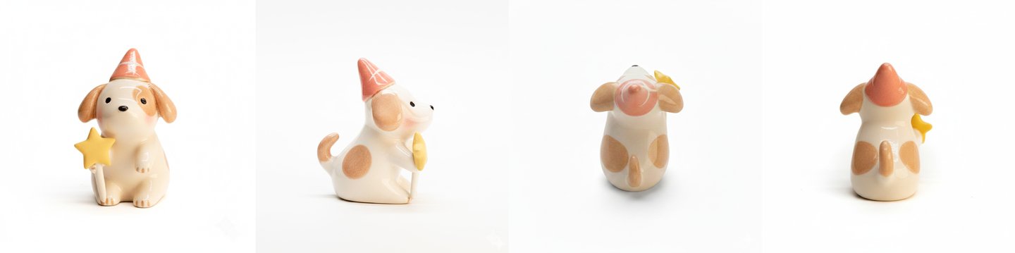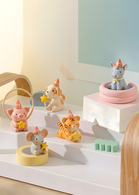 Нейтральный фон и мягкое освещение подчёркивают форму объектов и их глянцевую поверхность, усиливая сходство с фарфоровыми статуэтками и создавая аккуратную, спокойную подачу.