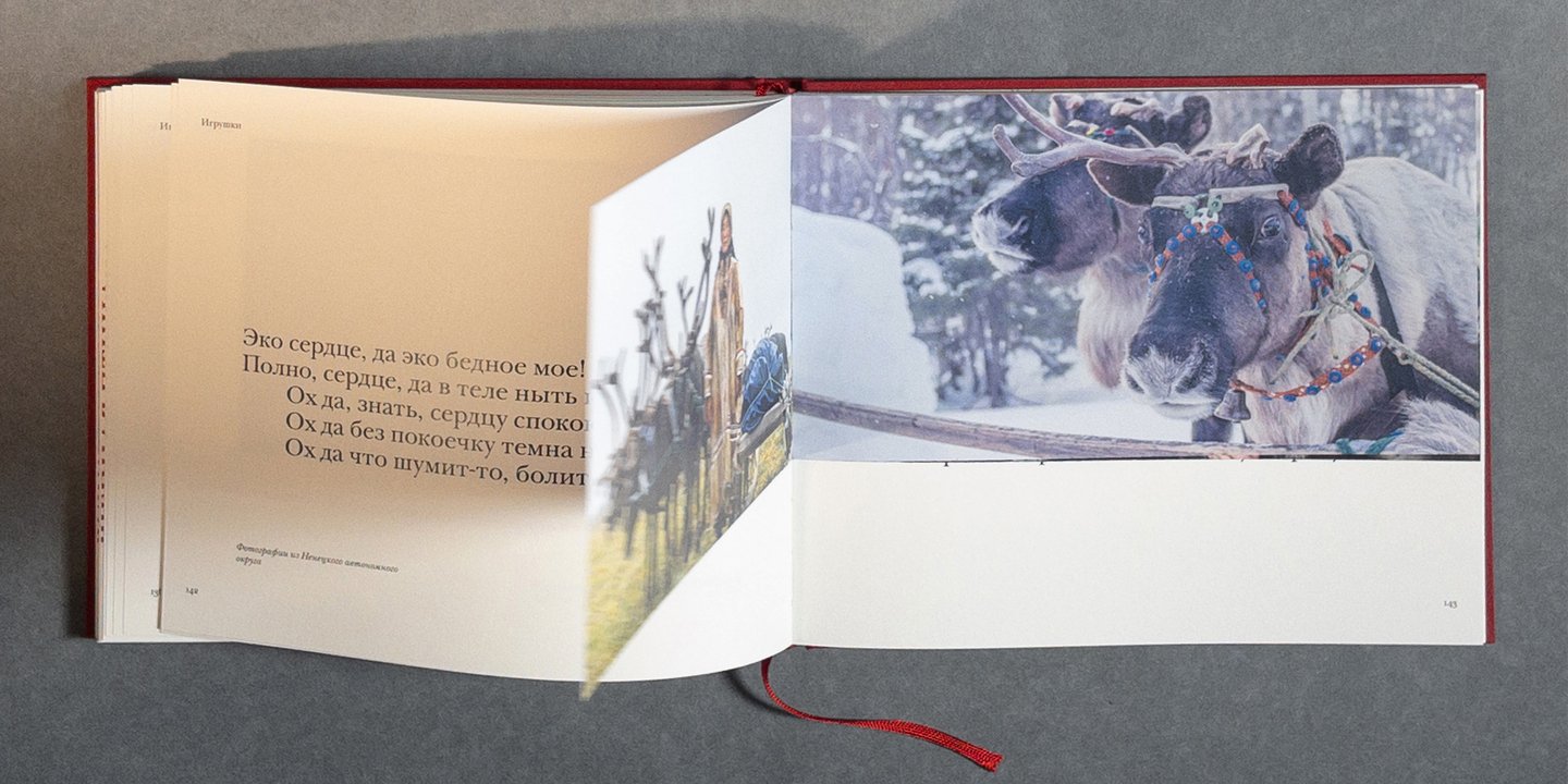 The book contains the main part about the applied art and the extra part with the song Folklore, which is included in the CBS photo album. The hardness in these two sections is different. The main part of the picture is based on the principle of the photo album: the images are sort of chaoticly stuck on the turn-up page, but in fact the way the images are presented changes depending on the section of the book. In an additional part of the photograph, the picture is left as a separate mini-book and is inserted in a twist with folk songs, the person opens the turn and first reads the beginning of the song, flashes the album and finishes the rest of the album. In mezeni, it’s just oral folk art, all of it is transmitted through songs, and I wanted to convey this air of humour through text and photos.
