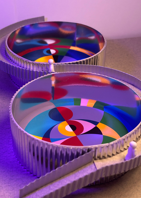 Макет выставочного пространства, построенного вокруг идеи взаимодействия формы, цвета и движения. Круговая композиция создаёт замкнутую, но динамичную среду. Выставка посвящена творчеству художника Робера Делоне.
