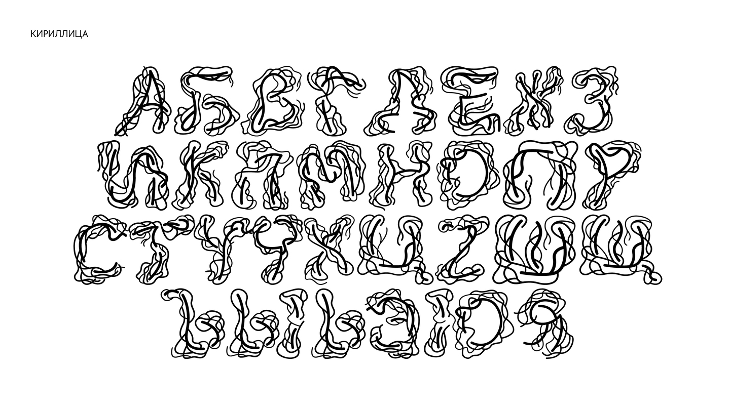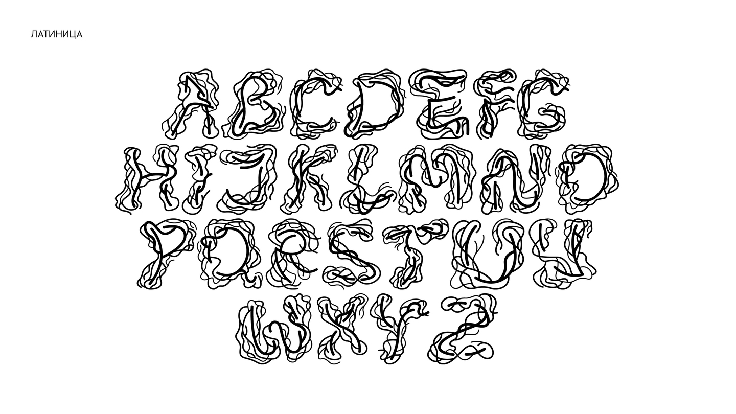 Выставка состоит из нескольких залов с работами автора. Жгуты выходят за пределы выставочных пространств, захватывают лестницы для перехода из зала в зал. Характер шрифта соответствует характеру жгутов: хаотичный, своенравный, будто живой организм.