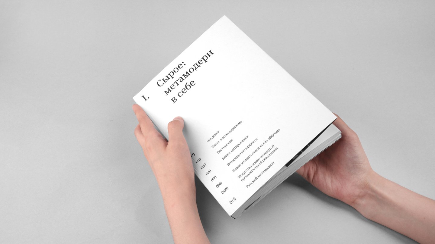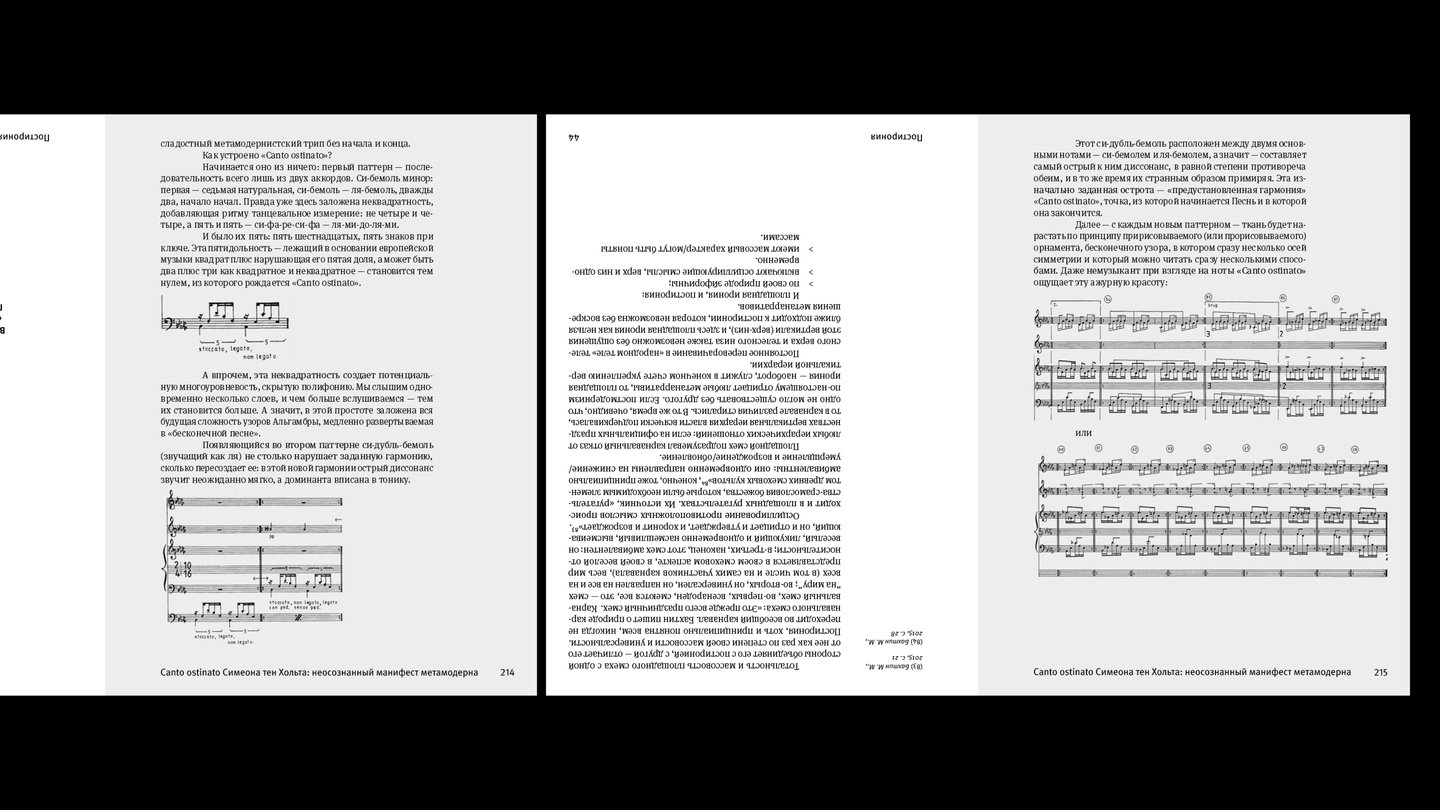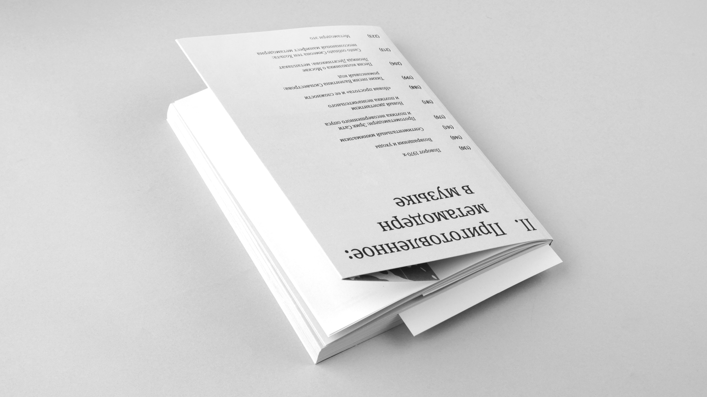 The conceptual basis of the project is to divide the book space into two sections. The two equal parts, «Old: Methamodern in themselves» and «Prepared: Methamodern in music», follow the adjacent strips in opposite directions.