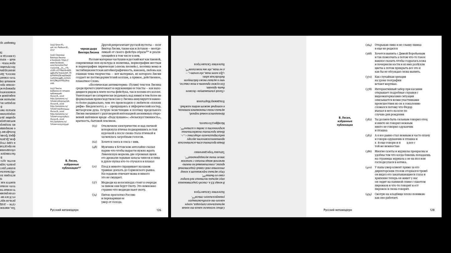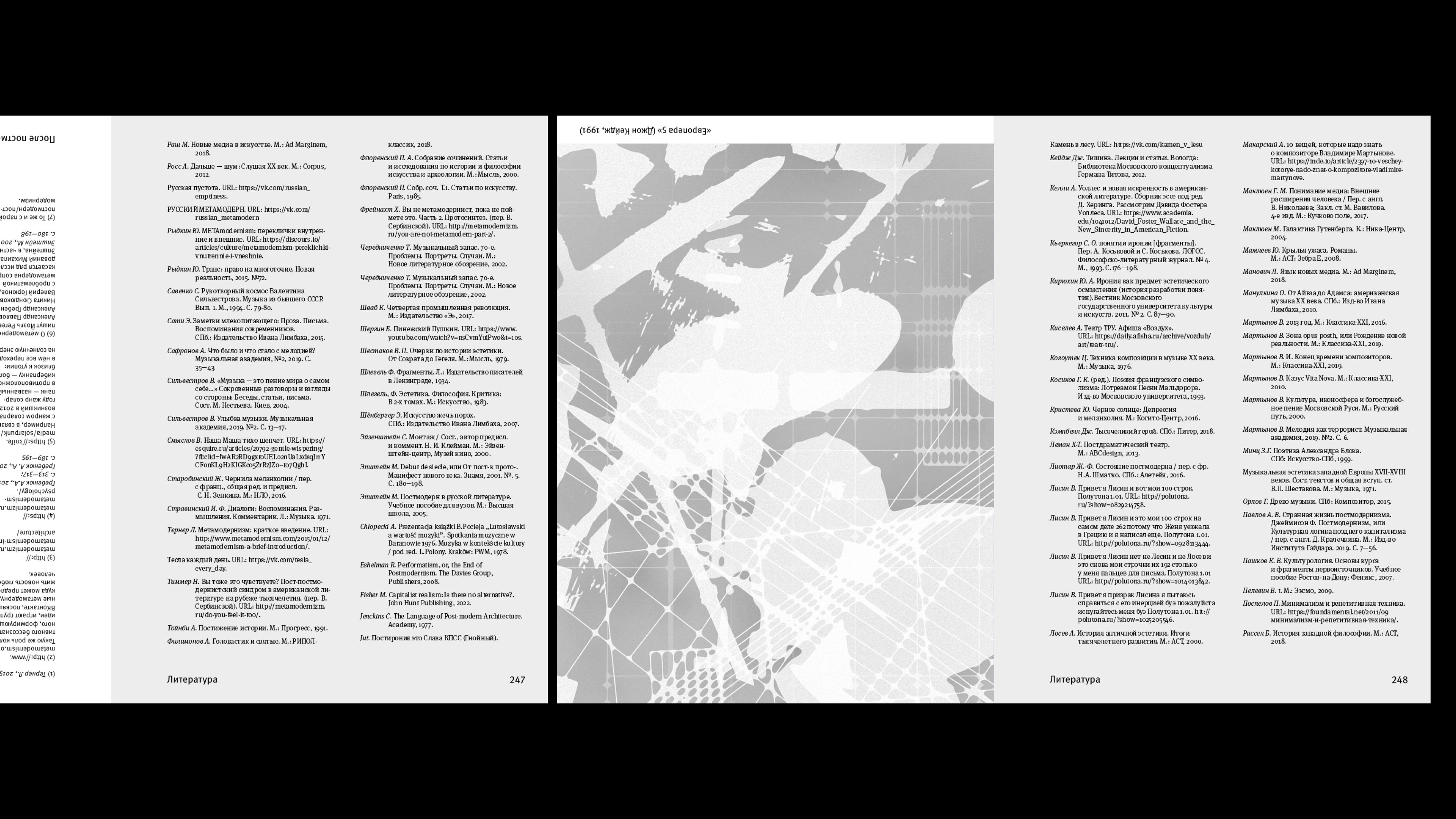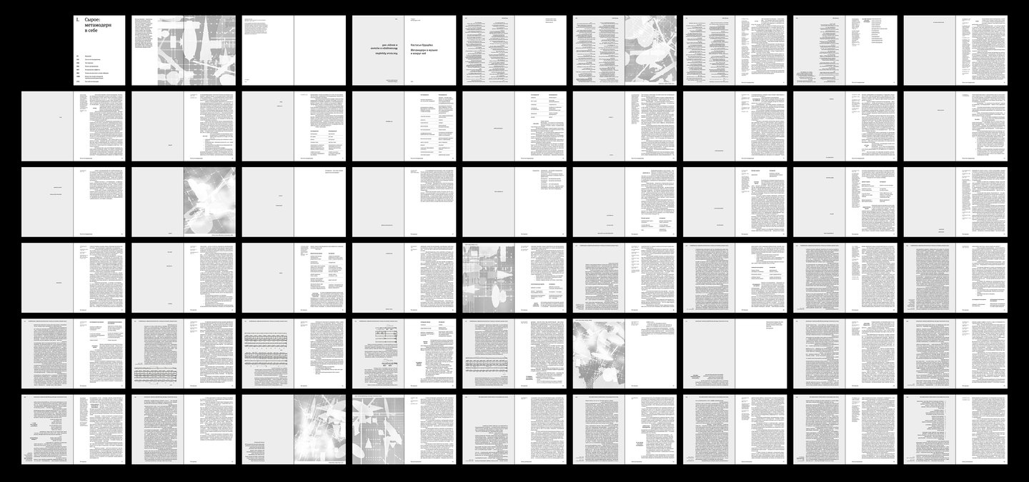 The conceptual basis of the project is to divide the book space into two sections. The two equal parts, «Old: Methamodern in themselves» and «Prepared: Methamodern in music», follow the adjacent strips in opposite directions.
