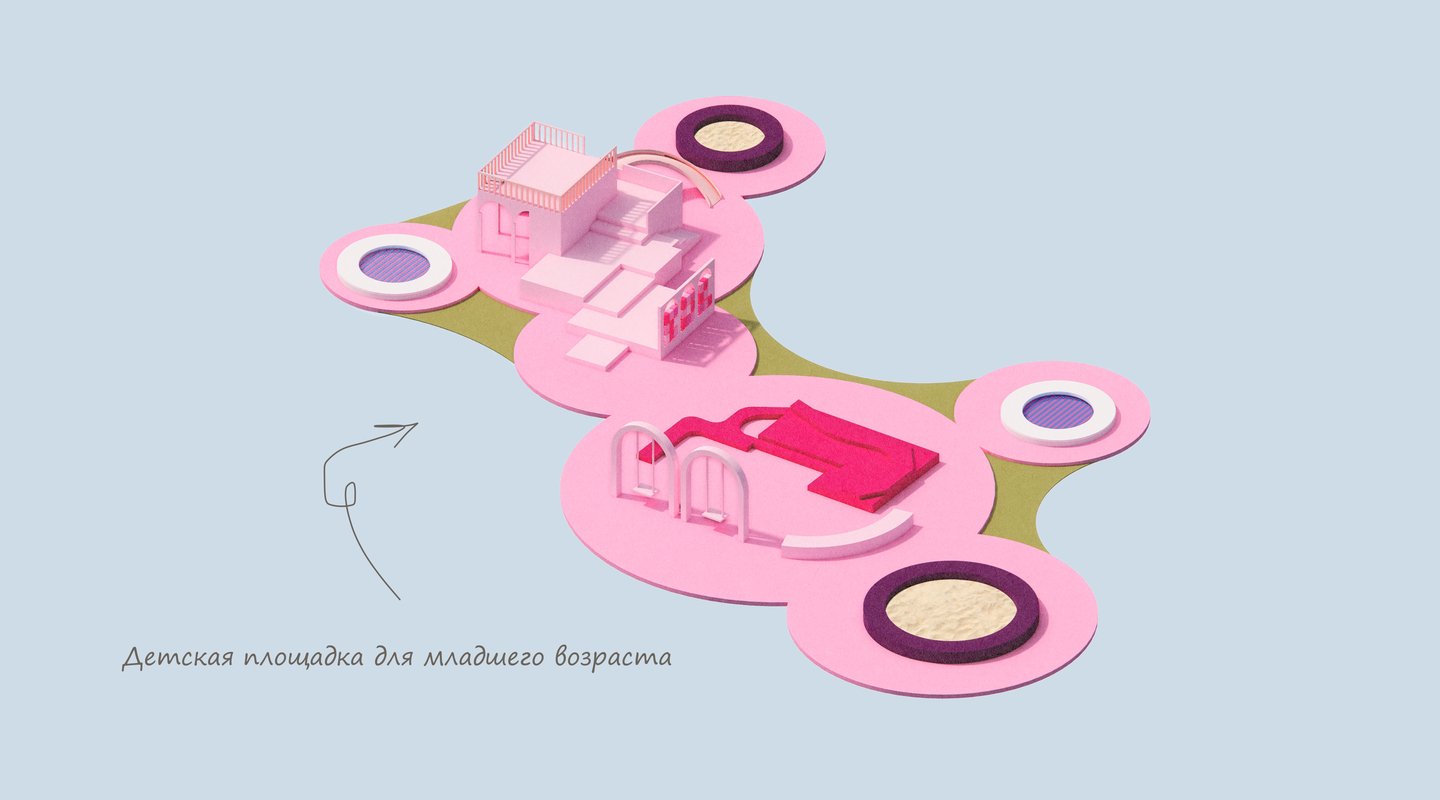 Детские площадки, выполненные в ярких цветах, своей насыщенностью и выразительностью отсылают к северному сиянию.