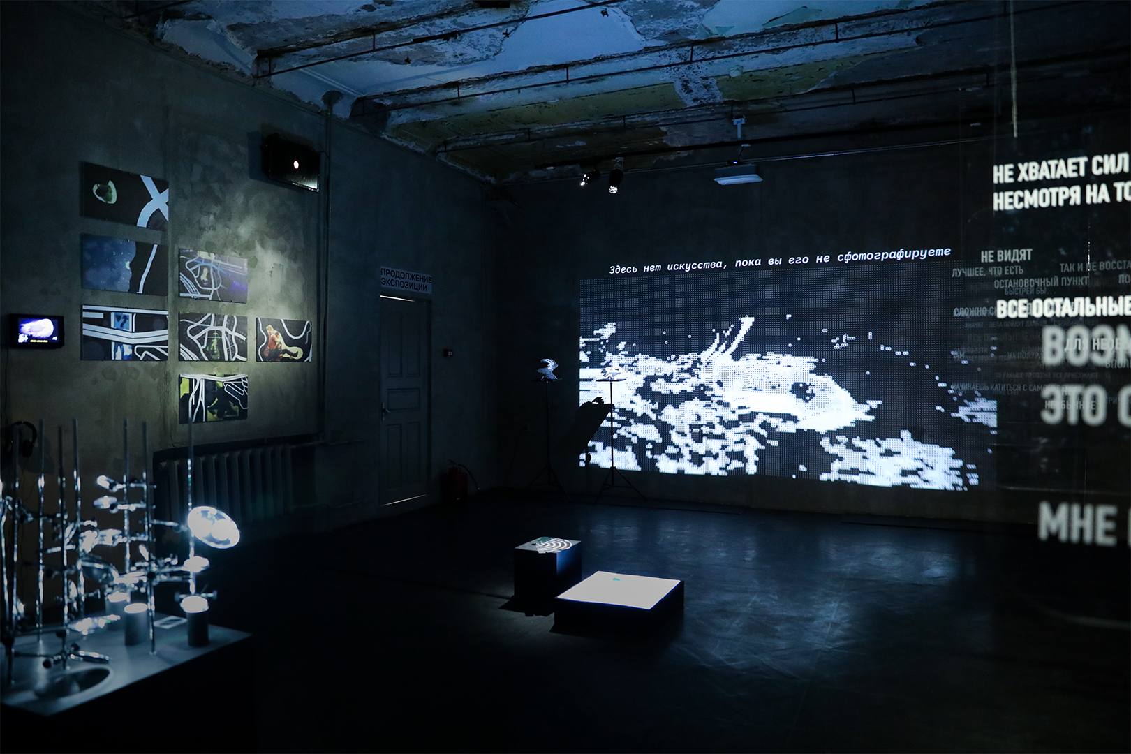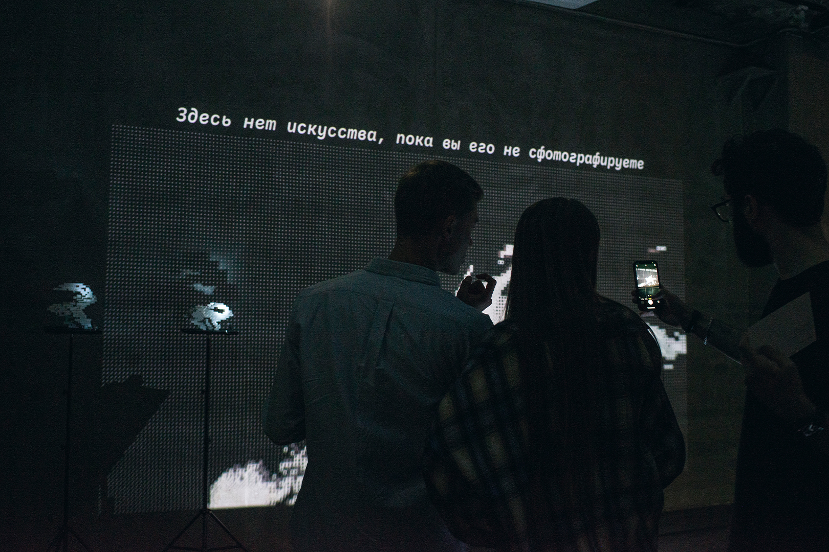 В этой инсталляции в равной мере важны видео на стене и результаты фотоохоты. «Здесь нет искусства, пока вы его не сфотографируете» существует и как проекция в пространстве, и как фотографии в устройствах зрителей. Покидая выставку, они уходят с его частью.