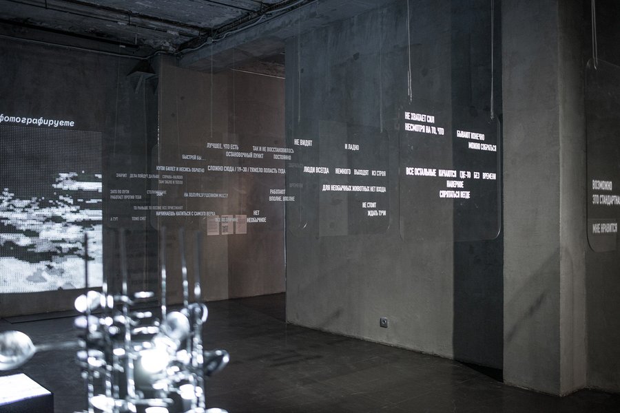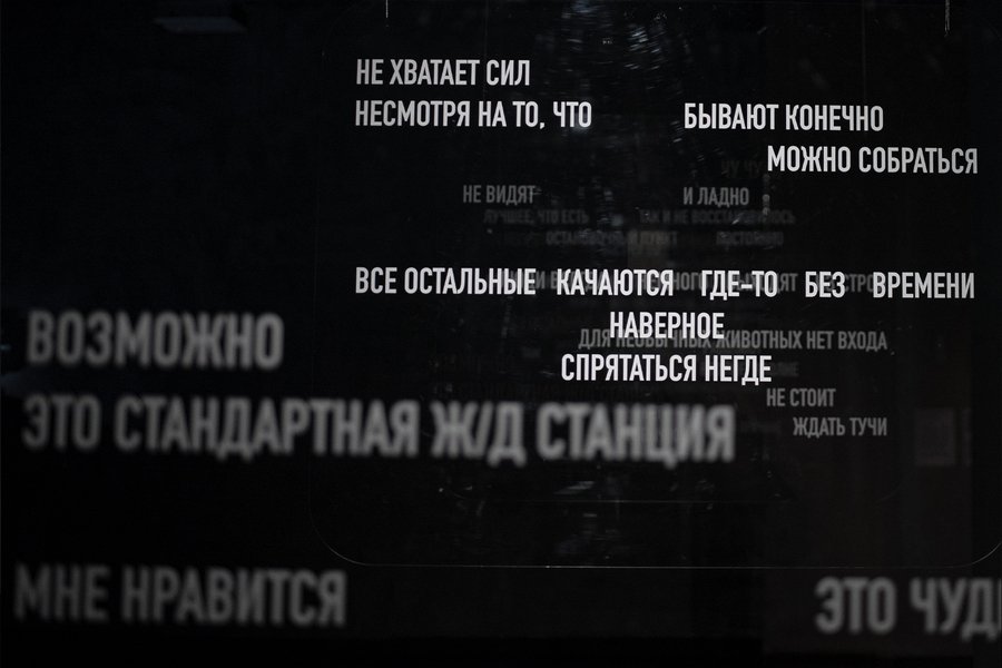 Облик места складывается из полифонии голосов, субъективных свидетельств и опытов. Облик железнодорожной станции — скорее облик не-места, пространства перехода, перевалочного пункта или отправной точки, которую нужно преодолеть, чтобы поскорей оказаться где-то. Собирая из фрагментов комментариев к станциям поэтические предложения, художница обнаруживает эстетическое в функциональном. Белые стихи складываются в инсталляцию-маршрут, собранную из «окон» пассажирских поездов — так гетерогенная природа текстов рифмуется с оптикой случайного пассажира, проносящегося мимо станции, который успевает ухватить лишь фрагментарный образ.