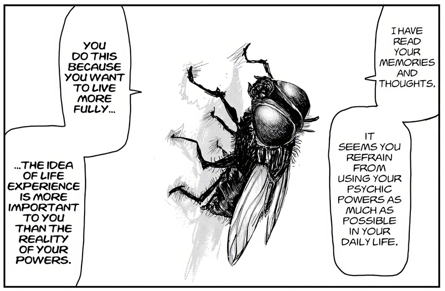 Муха ассоциируется в манге с разложением, навязчивостью и ощущением чего-то зловонного, присутствующего в привычном мире. Её появление подчеркивает моменты психологического распада, тревоги и внутренней нечистоты, являясь маркером скрытого зла и нарушения гармонии. Муха как бы «сигналит» о присутствии чего-то гнилого в отношениях между героями и в их сознании.