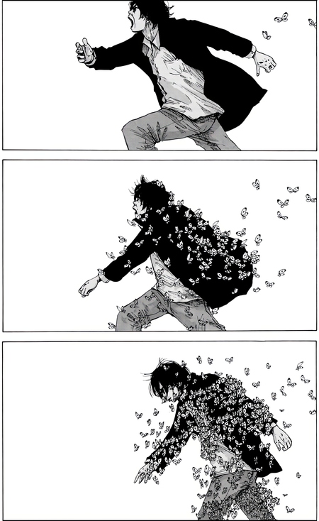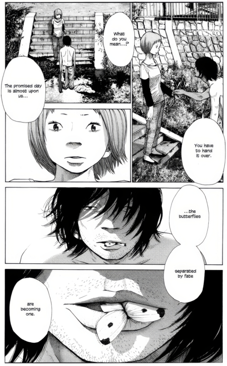 Примечательно, что в обеих мангах бабочки «заползают» в рот к убийце // 1. Инио Асано. «Голограф на Радужном поле». 2003 // 2. Осими Сюдзо. «Кровавый след». 2017