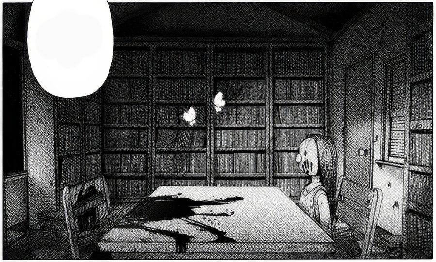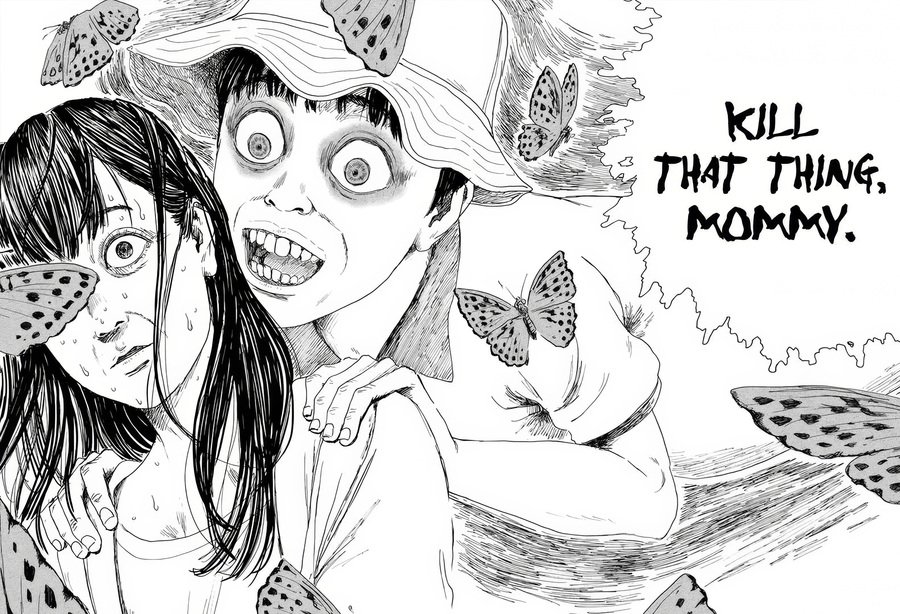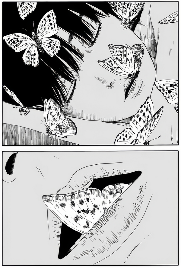 Бабочка в контексте «Кровавого следа» интерпретируется как символ хрупкости, перемен и амбивалентности. Она ассоциируется с моментами перехода, внутренней трансформации героя, а также с темой скрытой опасности под маской красоты и невинности — мотив, который проходит через всю мангу в образе матери Сэйити — Сокаку, — чья забота и гиперопека оказывается зловещей и разрушительной. Бабочка становится символом зыбкости границ между нормальностью и безумием, между любовью и насилием. Здесь семантика инсектного символизма претерпевает значительную трансформацию, отходя от традиционных фольклорных значений и приобретая черты сакрализации обыденного и низменного. Так, бабочка, считавшаяся вестником благополучия, обретает мрачный, пугающий смысл, отсылает к травме, а муха, изначально воспринимаемая как повседневный спутник человеческой жизни, становится символом, который парадоксальным образом обретает новые, глубокие и многозначные смыслы.
