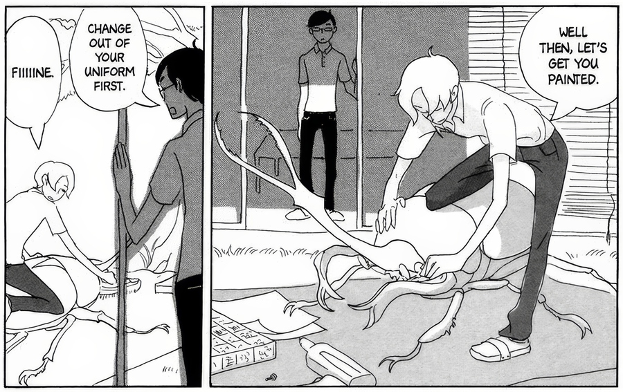 * это может показаться неудивительным, ведь авторское видение и художественный метод Харуко Итикавы сводятся к уникальным стилистическим решениям — герои (даже в своем «человеческом» обличии) напоминают насекомых своим худощавым телосложением, длинными конечностями, уточненными чертами и позами.