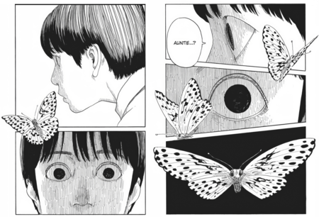 Так, «насекомое» как образ предстает в манге в двух связанных и взаимодополняющих воплощениях — неконтролируемого бушующего роя и загадочной девушки по имени Мунакато Кикуко. Образ инсектного роя в манге функционирует в ключе экзистенциальной тревоги и постгуманистской критики антропоцентризма, где человек лишён традиционного статуса субъекта и оказывается подчинённым более древним и адаптивным формам бытия. Визуальная символика манги насыщена элементами, которые можно интерпретировать через призму теории абсурда. Например, мотив множества глаз как знака всевидящего контроля перекликается с концепциями паноптизма и социальной коллективной дисциплины, выявляя механизмы подавления индивидуальности и приватности.